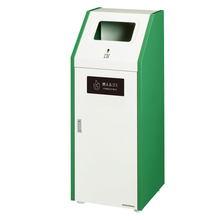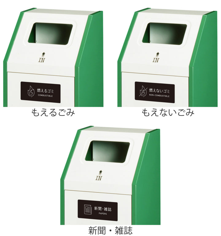 アイボリーとグリーンのツートンカラーでレトロな分別用ダストボックスで、複合施設やレジャー施設などの屋内用ゴミ箱として配置いただけます。ごみの種類別に、ダストボックス本体に貼れる分別用シールが付属しています。(お客様貼付)