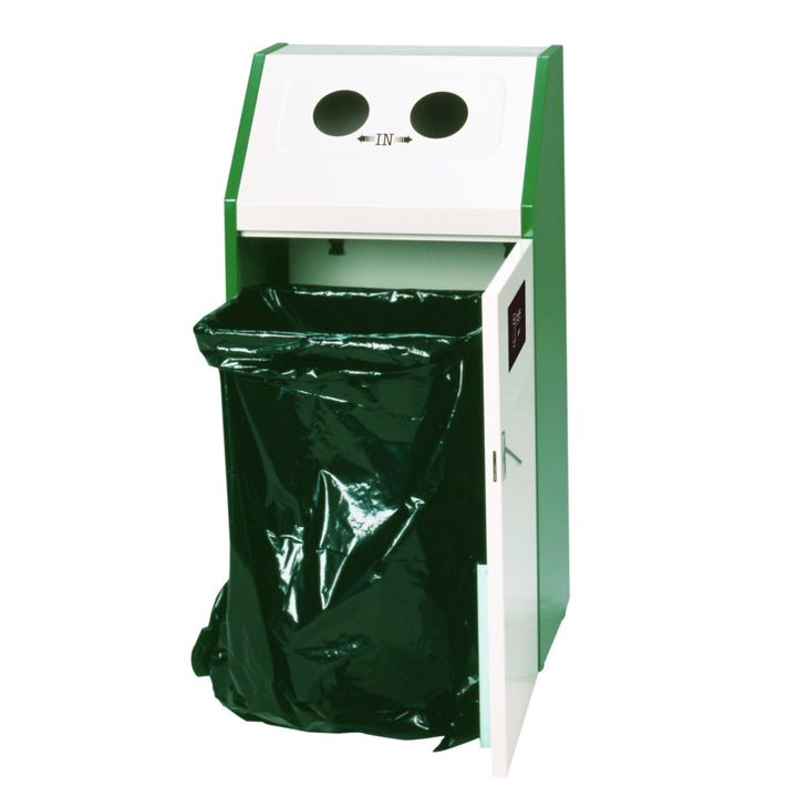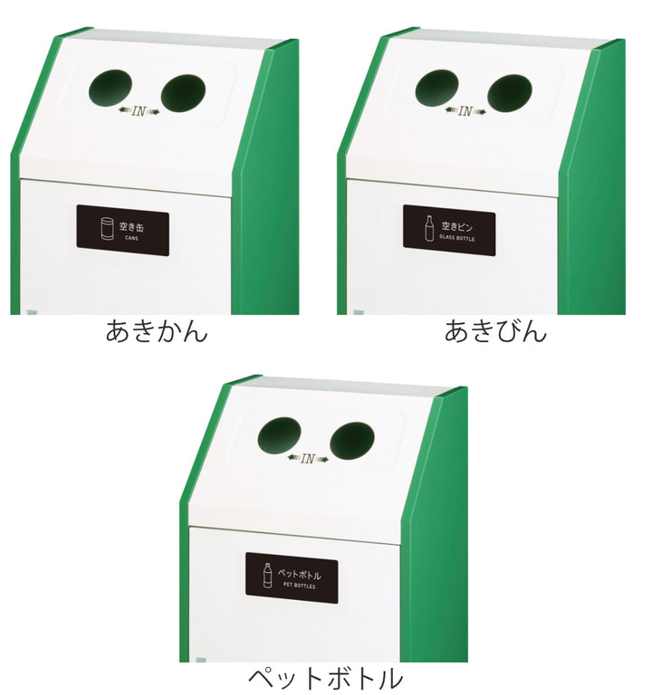 アイボリーとグリーンのツートンカラーでレトロな分別用ダストボックスで、複合施設やレジャー施設などの屋内用ゴミ箱として配置いただけます。ごみの種類別に、ダストボックス本体に貼れる分別用シールが付属しています。(お客様貼付)