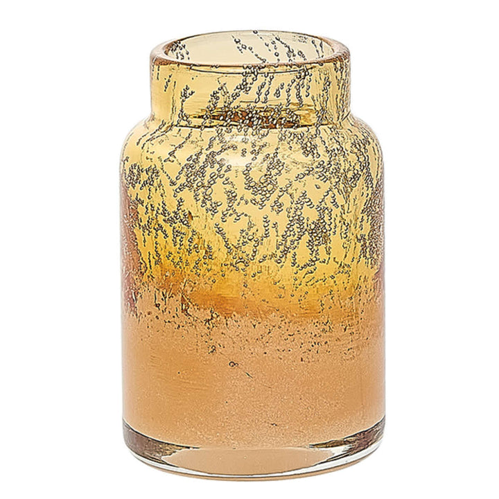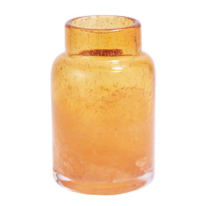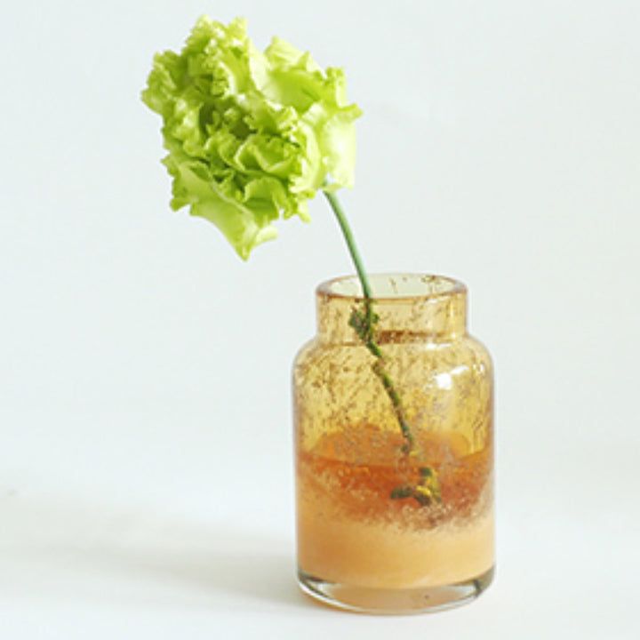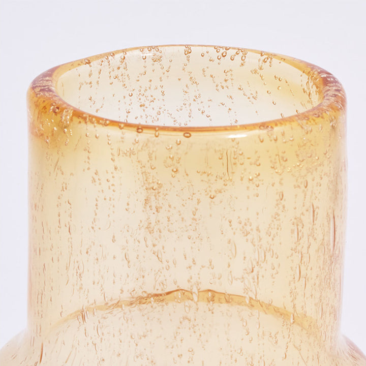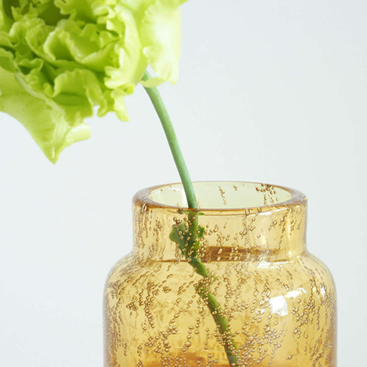 気泡デザインが入ったイエローのクリアガラスの花瓶です。口元は透明で底の方は白色かかっています。アンティーク感のある上品なカラーです。