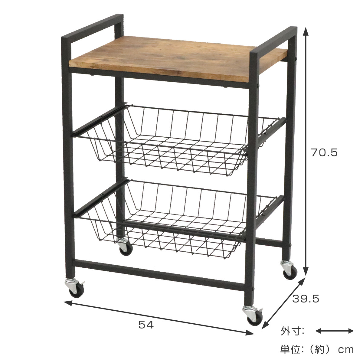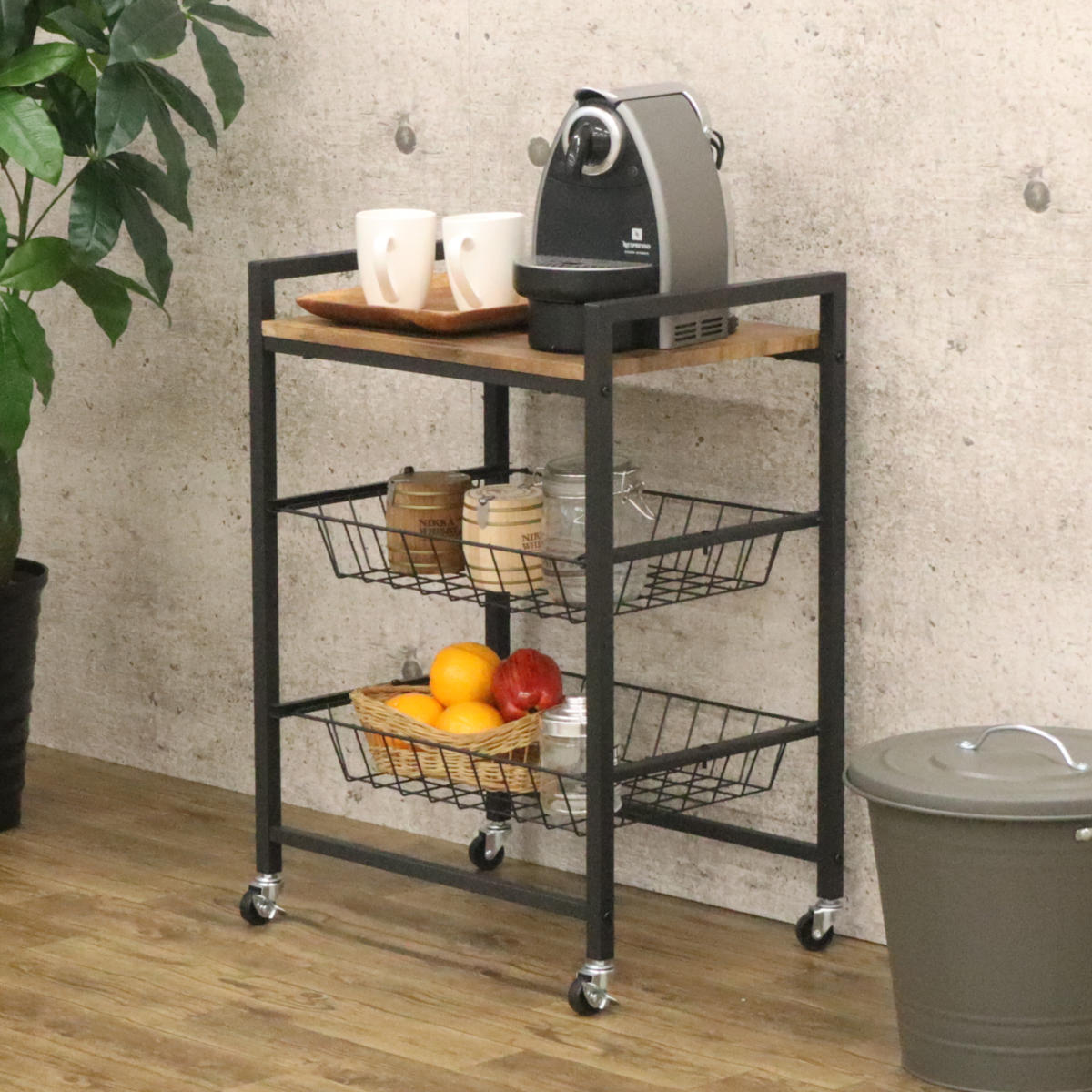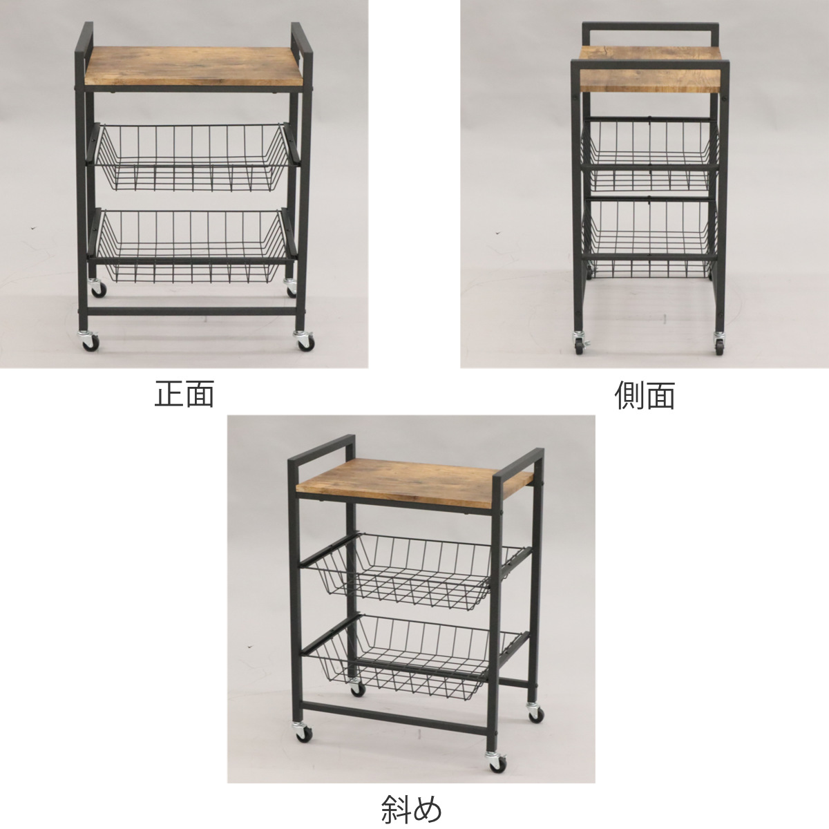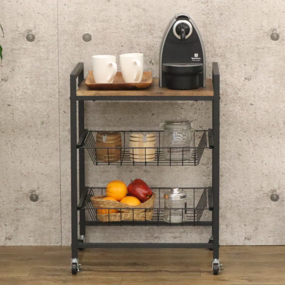 ヴィンテージ調のリアルな木目柄のPVCを使用したキッチンワゴンです。落ち着きのあるカラーとシンプルなデザインでモダンな雰囲気を演出します。キッチン小物を収納したり、ストッカーやデスクサイドワゴンとしても使いやすいサイズです。