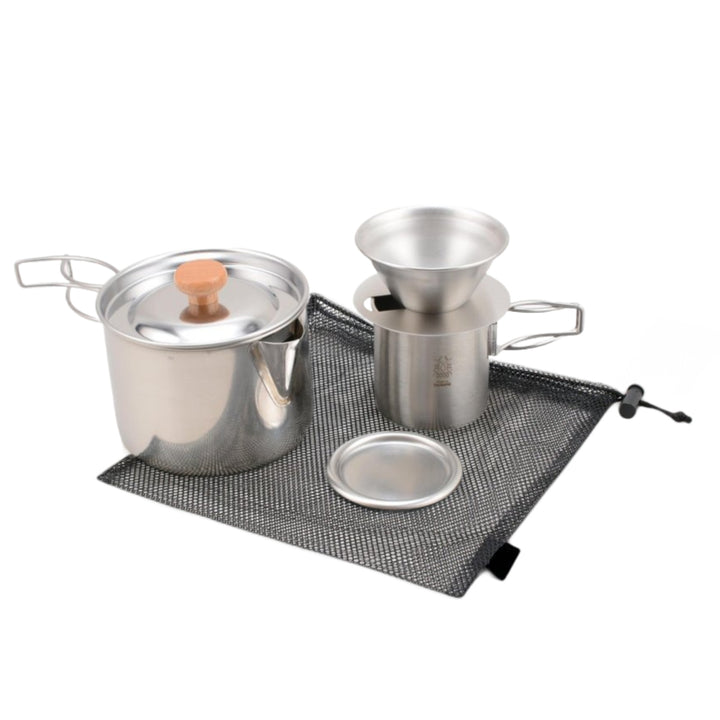 お鍋とケトルが一つになった「ケトルクッカー」と、分割式ドリッパー二重マグカップのセットです。どこでも本格的なドリップコーヒーをお楽しみいただけます。ステンレス製の錆びにくく丈夫な仕様で、便利な収納袋付きなのでアウトドアへの持ち運びにぴったりです。
