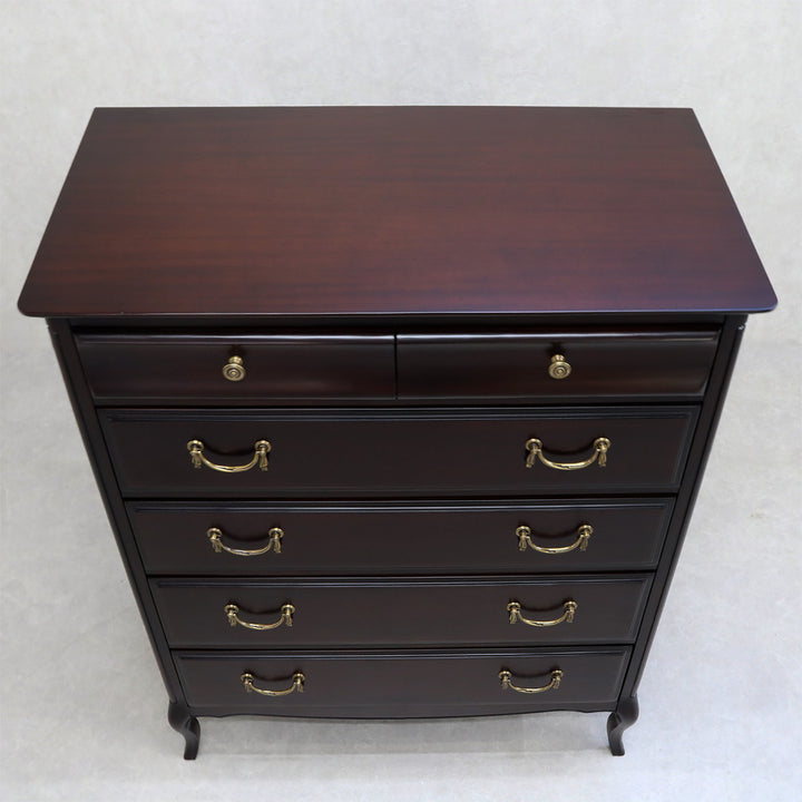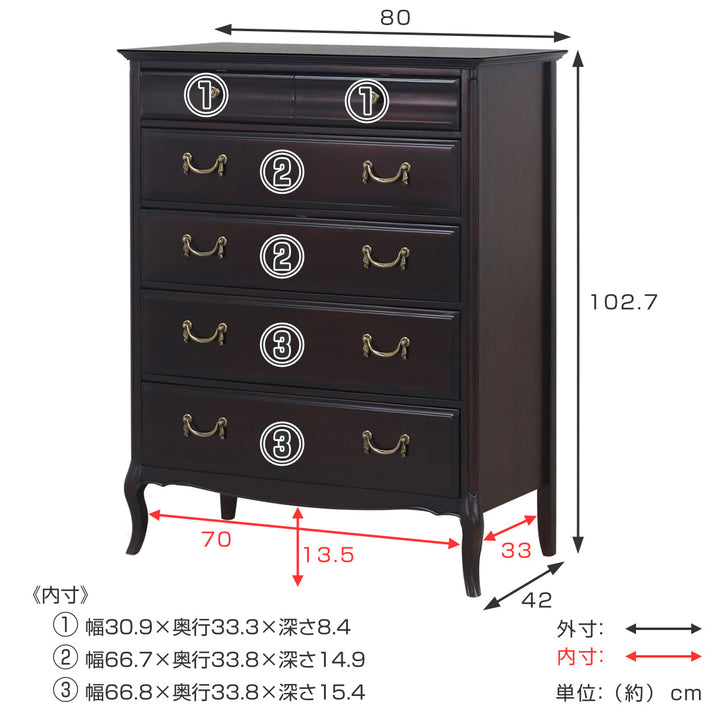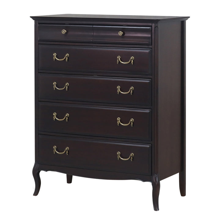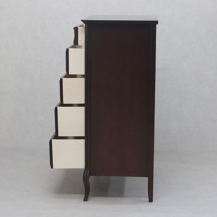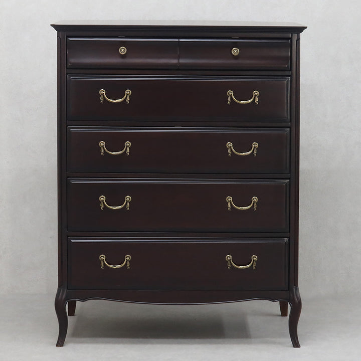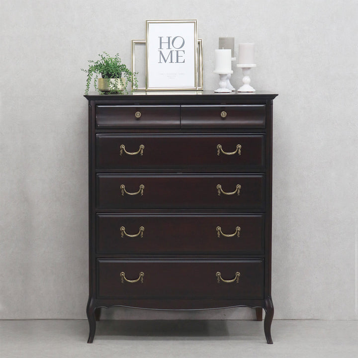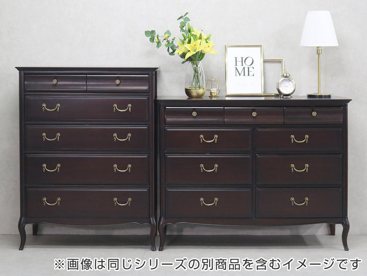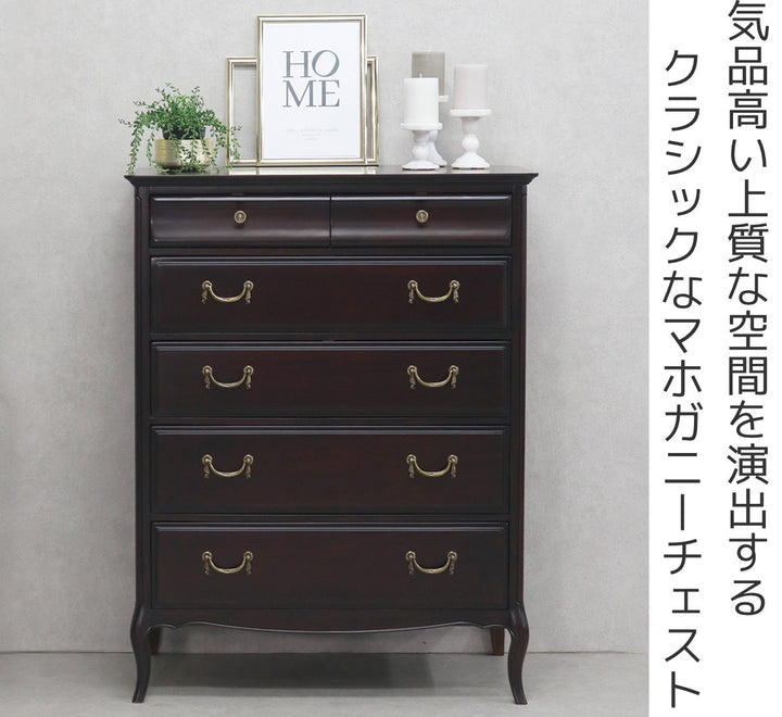天然のマホガニーを使用した高級感漂うクラシックなチェストです。丁寧に作られた曲面を活かした前板や脚部が存在感を放ち、ホテルライクなインテリアを実現します。アンティーク調やシャビーシックなインテリアにもおすすめです。