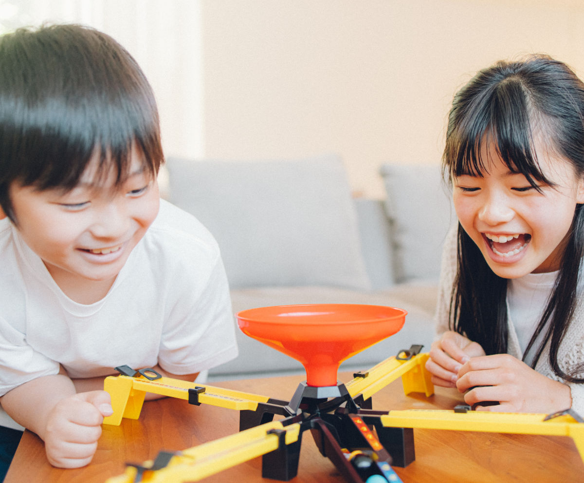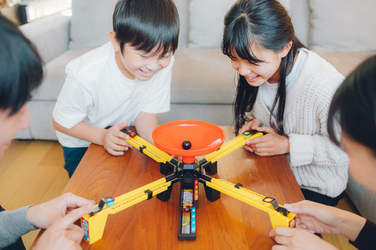 このゲームはボムボールが落ちてくるタイミングを見極めて、いかに自分のボールをボムボールが落ちる直前に落とすことができるかを競います。ルールは簡単で、短時間決着、プレイ人数は2~4人です。家族や仲間と、様々なシーンでみんなで盛り上がれる、究極のタイミングを競うアクションゲームです。対象年齢は6歳以上です。