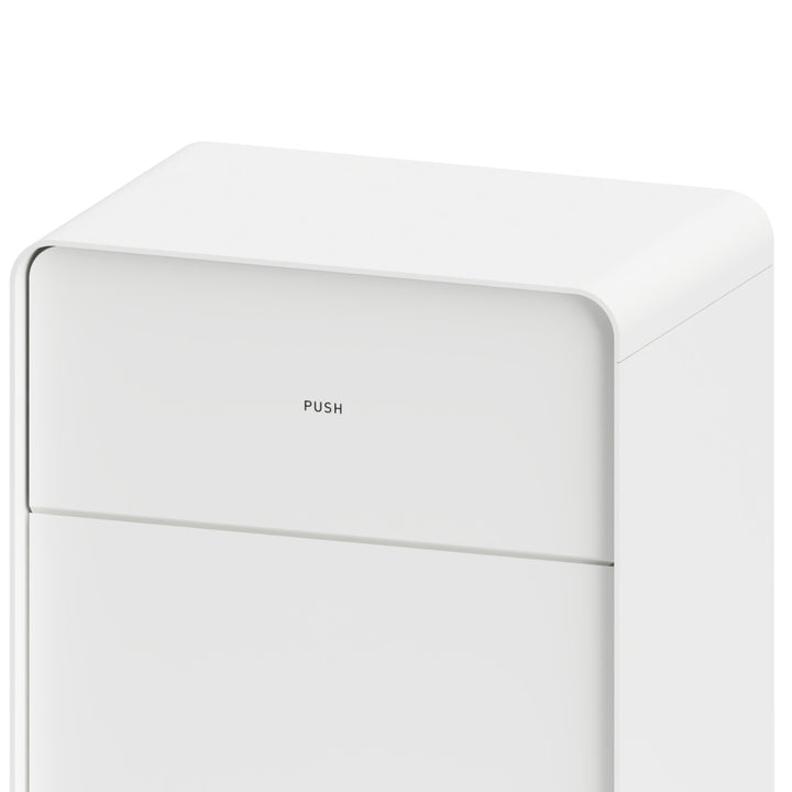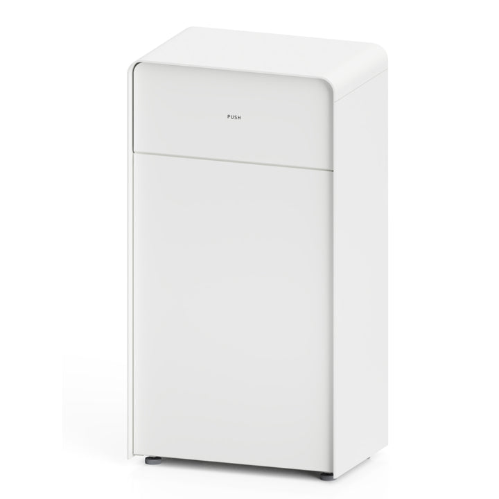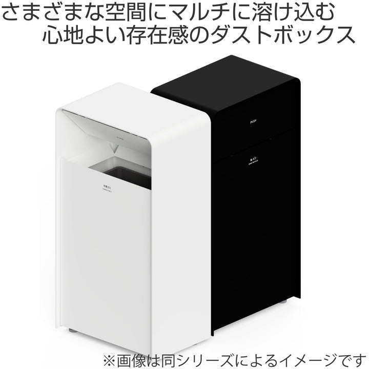 プッシュ式前扉でシンプルなビジュアルなので、存在を主張しすぎることなく、どこに置いても景観を損わずにダストボックスとして成立します。足元にはアジャスターが付いているので、設置時のガタつきを抑えることができます。
