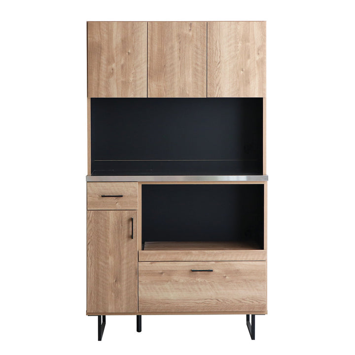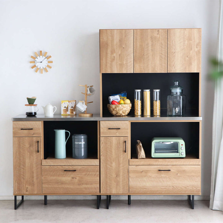 キッチンボードのオープン部分にステンレスを使用し、お手入れしやすく配慮しています。溢れた調味料もサッと拭けるので清潔な状態を保つことができます。本体には脚が付いているので、汚れの溜まりやすいキッチン下の掃除もらくらくです。