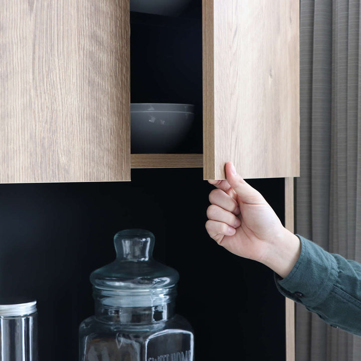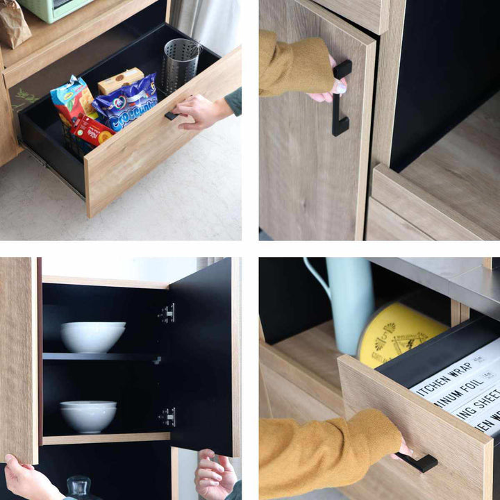 大きく引き出せて、たっぷり収納ができるので、キッチン用品や保存食などを入れることができます。上部の棚には、食器を入れることができ、取り出しやすい高さになっているのも嬉しいポイントです。
