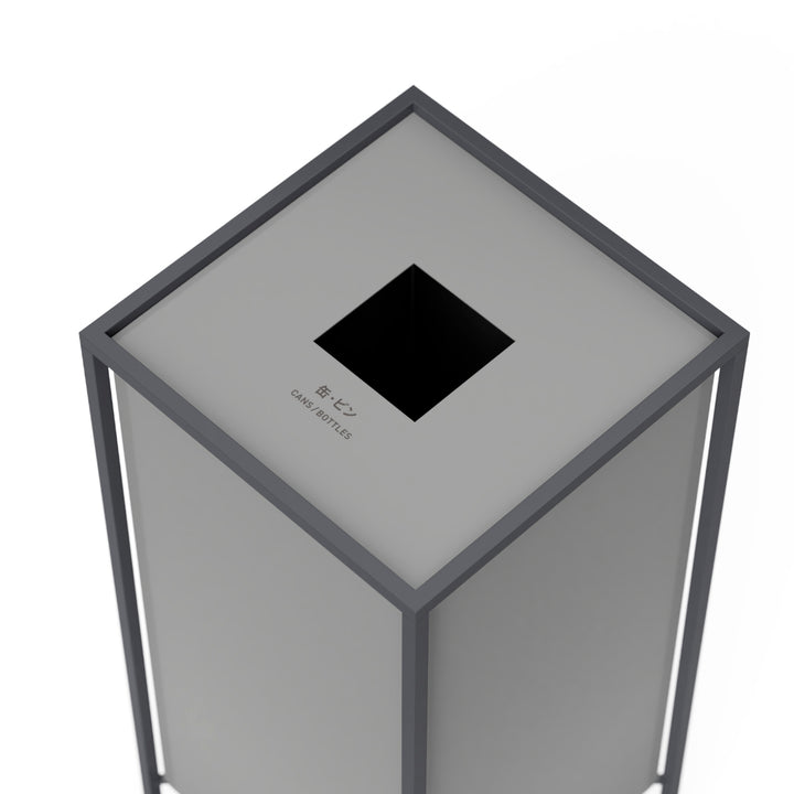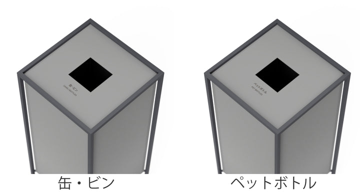 ビン・カン・ペットボトルなどのゴミを投入できる、投入口が一辺10cmの角穴タイプです。分別の表示が前扉に記載されているので一目でわかります。