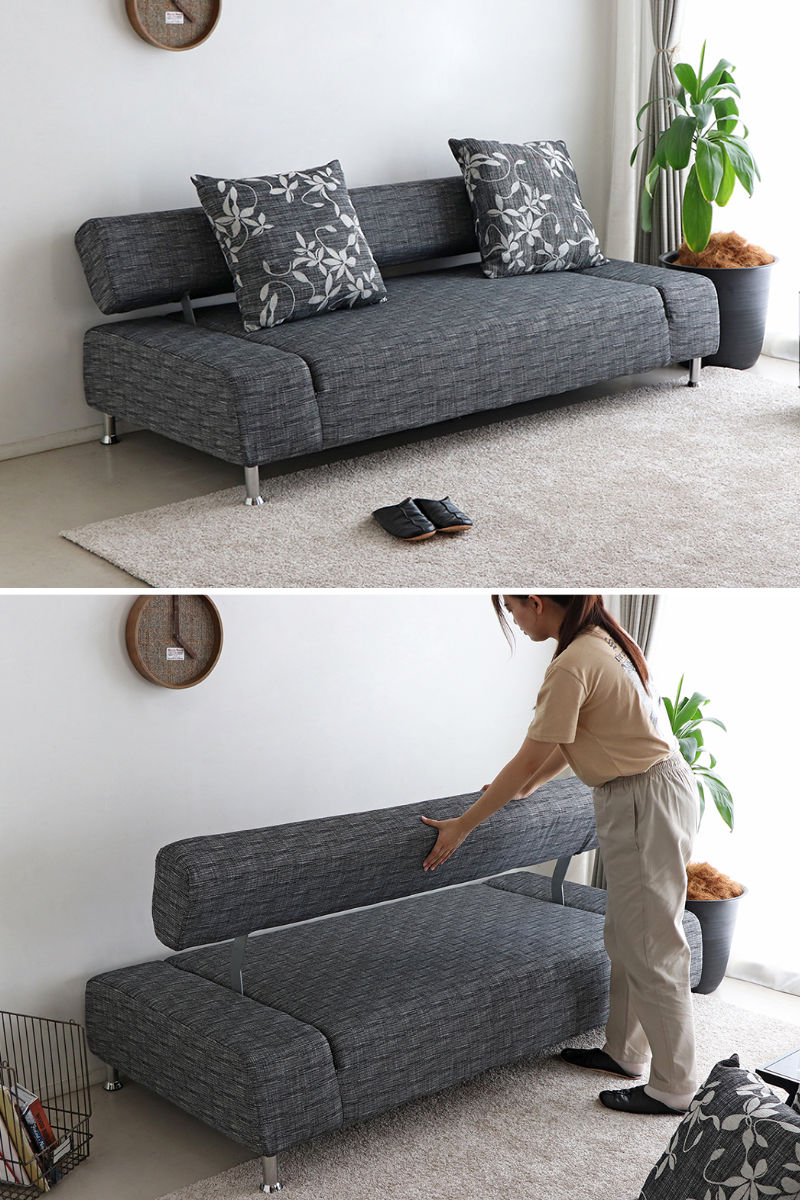ソファからベッド・ベッドからソファの切り替え時、ソファを動かさず壁に付けたまま操作できます。急な来客やちょっとしたお昼寝時も簡単に切り替えられます。ワンルームや一人暮らしのお部屋など狭い場所でもスペースを有効活用しながらお使いいただけます。