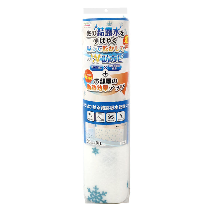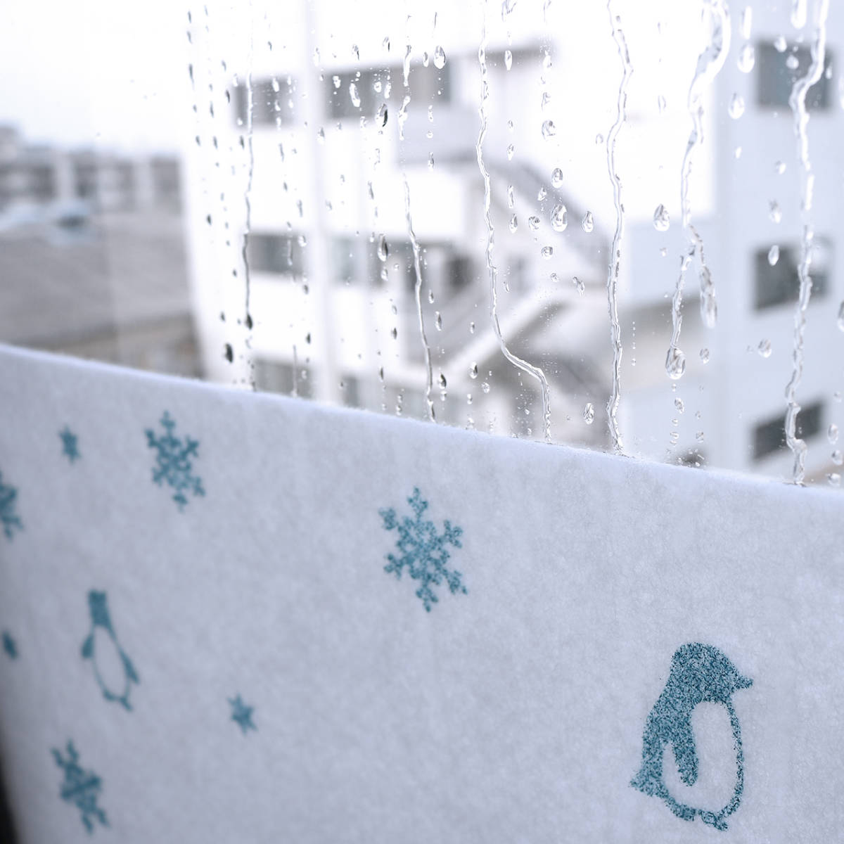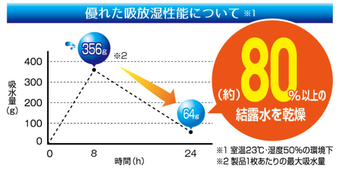 吸放湿繊維を使用しているので、優れた吸水力と乾燥力を発揮し、結露により発生した水滴をしっかり吸収します。自然蒸発するのでカビの発生やカーテンのシミを防止でき、断熱効果もあるので、窓から伝わる冷気を遮断し、表面温度が約4度アップします。