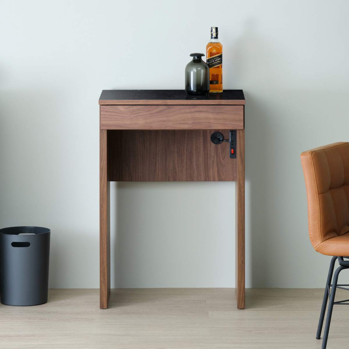2口コンセント付きで、調理スペースとして使用する他にも、電化製品の設置など様々な用途でお使いいただけます。またコード類を裏に通す事ができる配線穴もあり、ごちゃつかずスッキリとした印象になります。