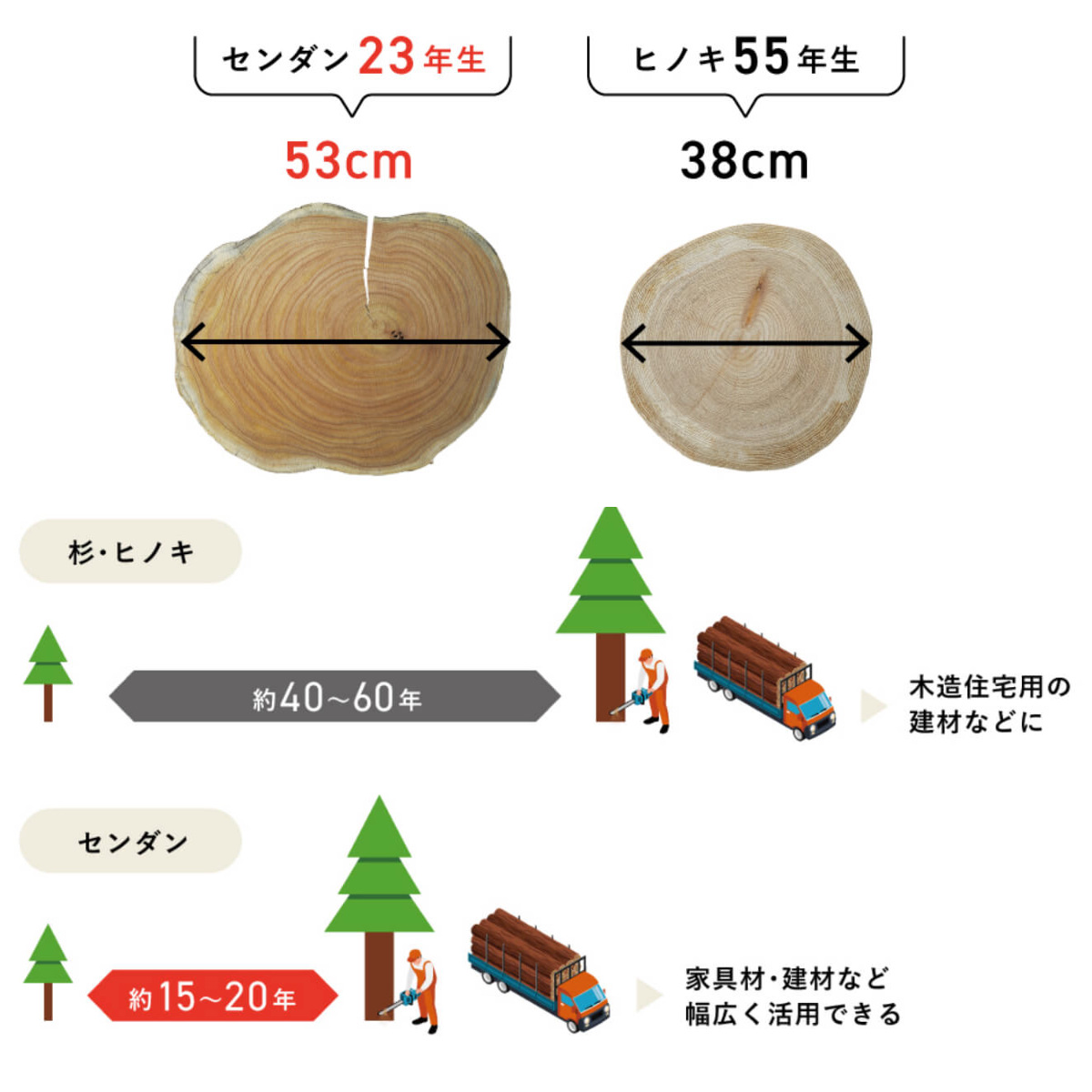 センダン1本あたりの炭素量は、杉やヒノキに比べ約6倍※高くなります。センダンを植樹し活用することで地球温暖化の進行を抑える役割も担っています。