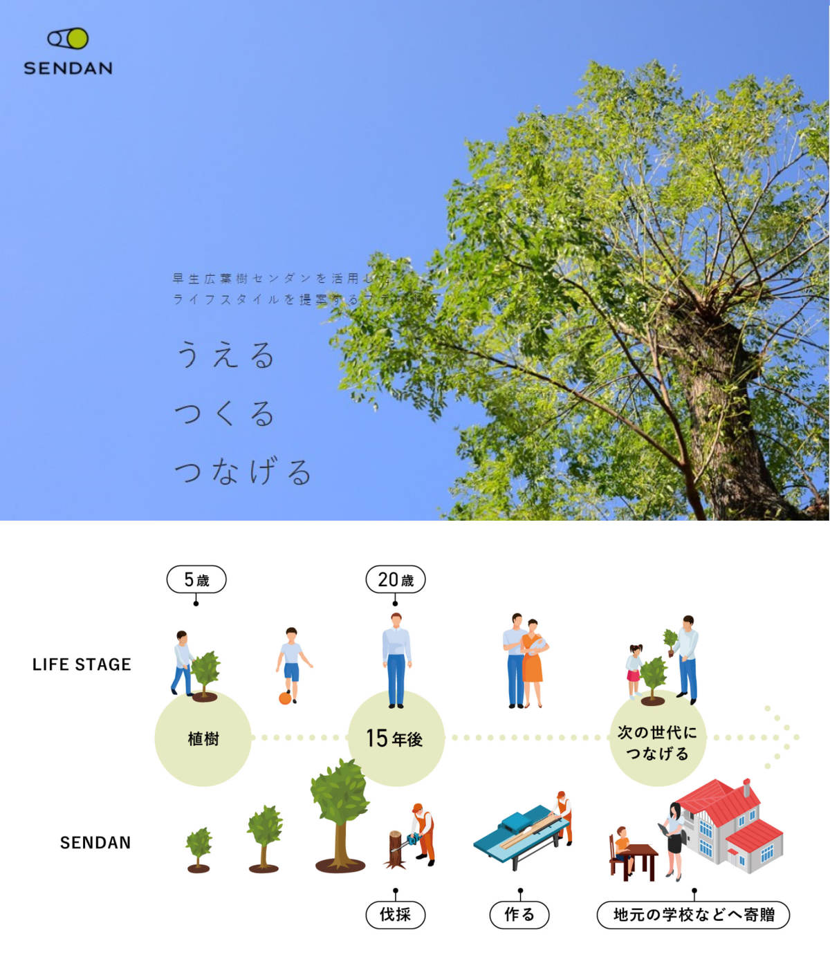 SENDANとは、SOUSEIプロジェクトから生まれたサスティナブルな木材であるセンダンを活用したライフスタイルを提案するブランドです。センダンを積極的に活用し、持続可能なサイクルを構築することを目指しています。