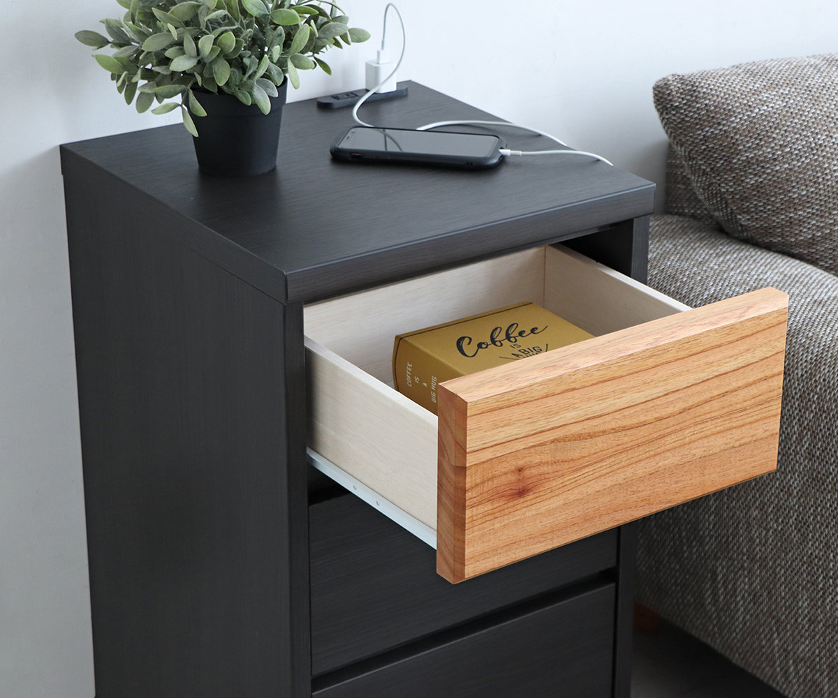 3段の引出しはレール付きで引き出しやすいスライドレールなので、お子様やご年配の方でも開け閉めが簡単です。