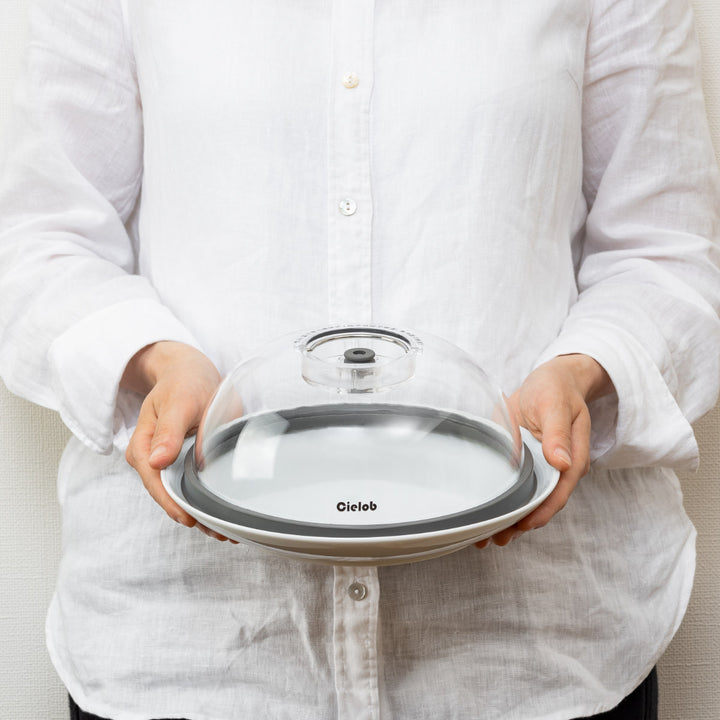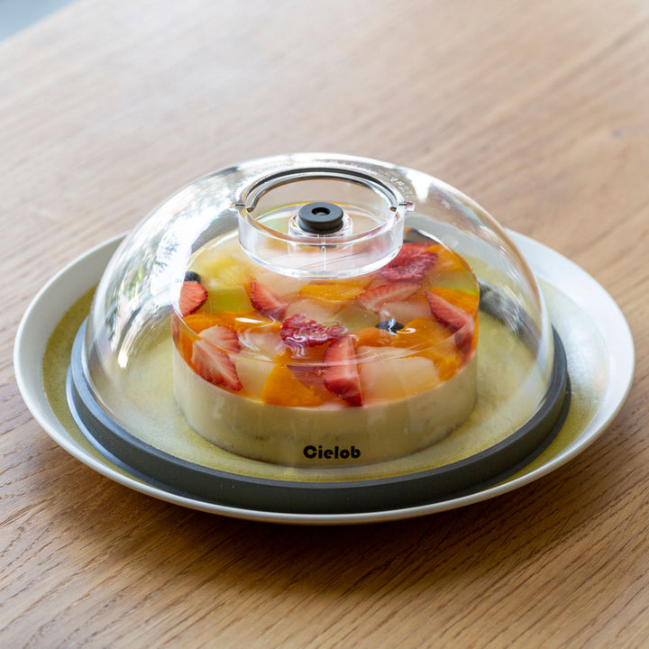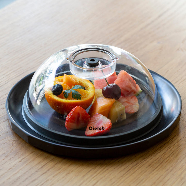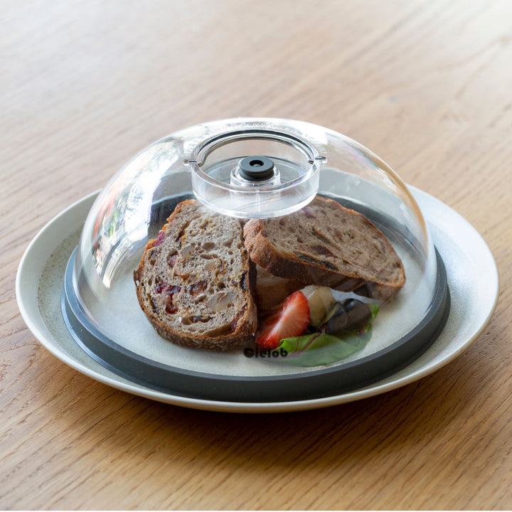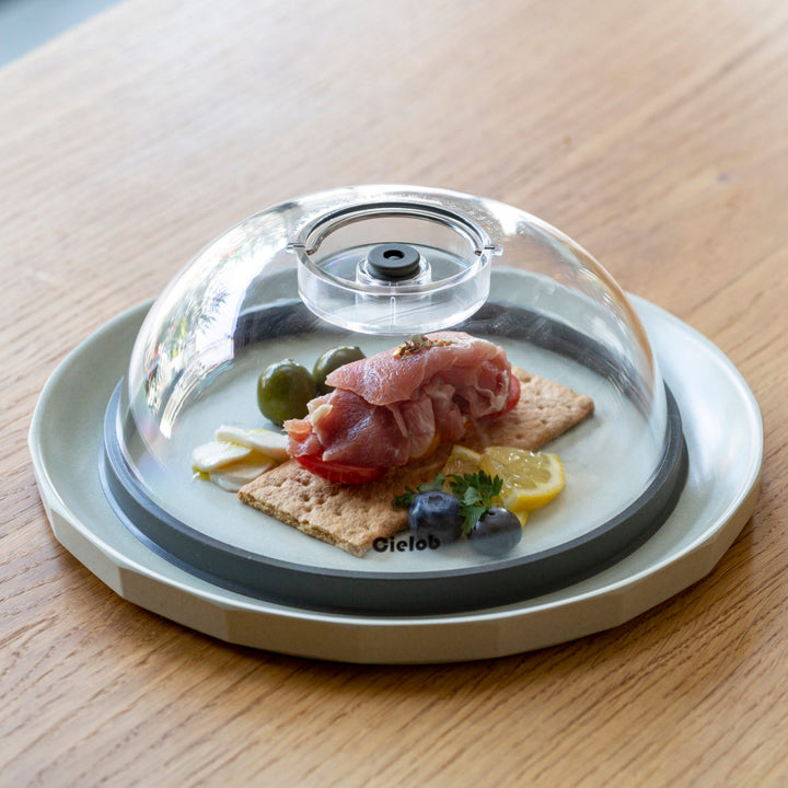 お料理にかぶせてバキュームポンプ(別売り)をセットし、電源ボタンを押すだけで、ポンプがプレートとキャップの中を真空状態に調整します。また開ける時は、真ん中のシリコンキャップを外して真空状態を解除し、取っ手を持って簡単に開けられます。