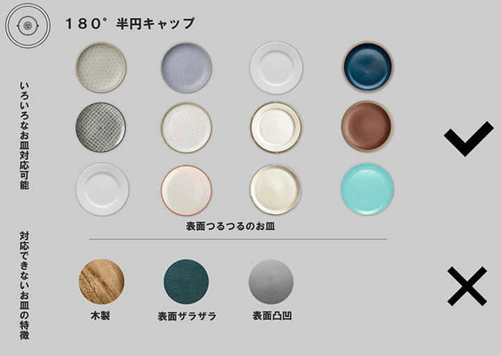 表面のつるつるとしたプレートにお使いいただけます。(※木製のプレートや表面のざらざらとしたプレート、また凹凸のあるプレートには対応していません。)
