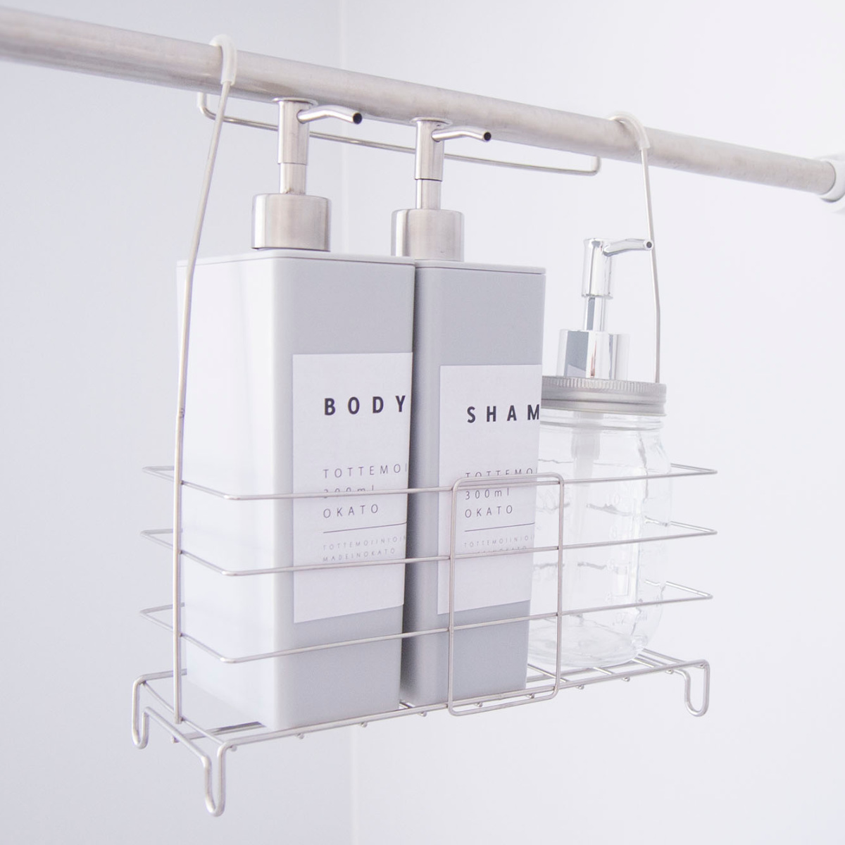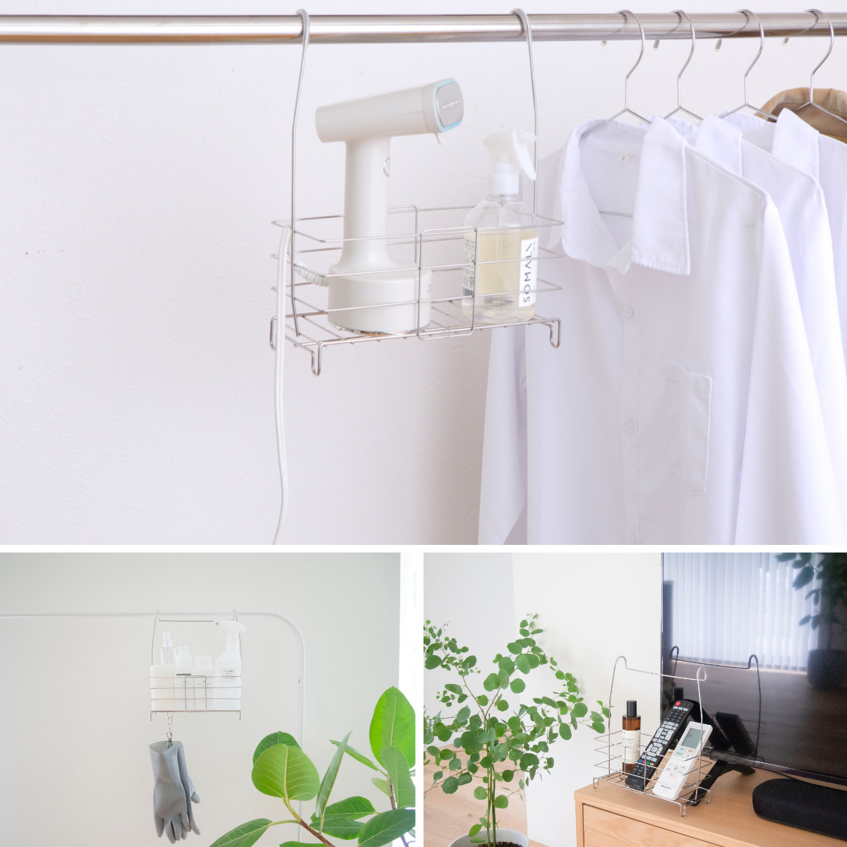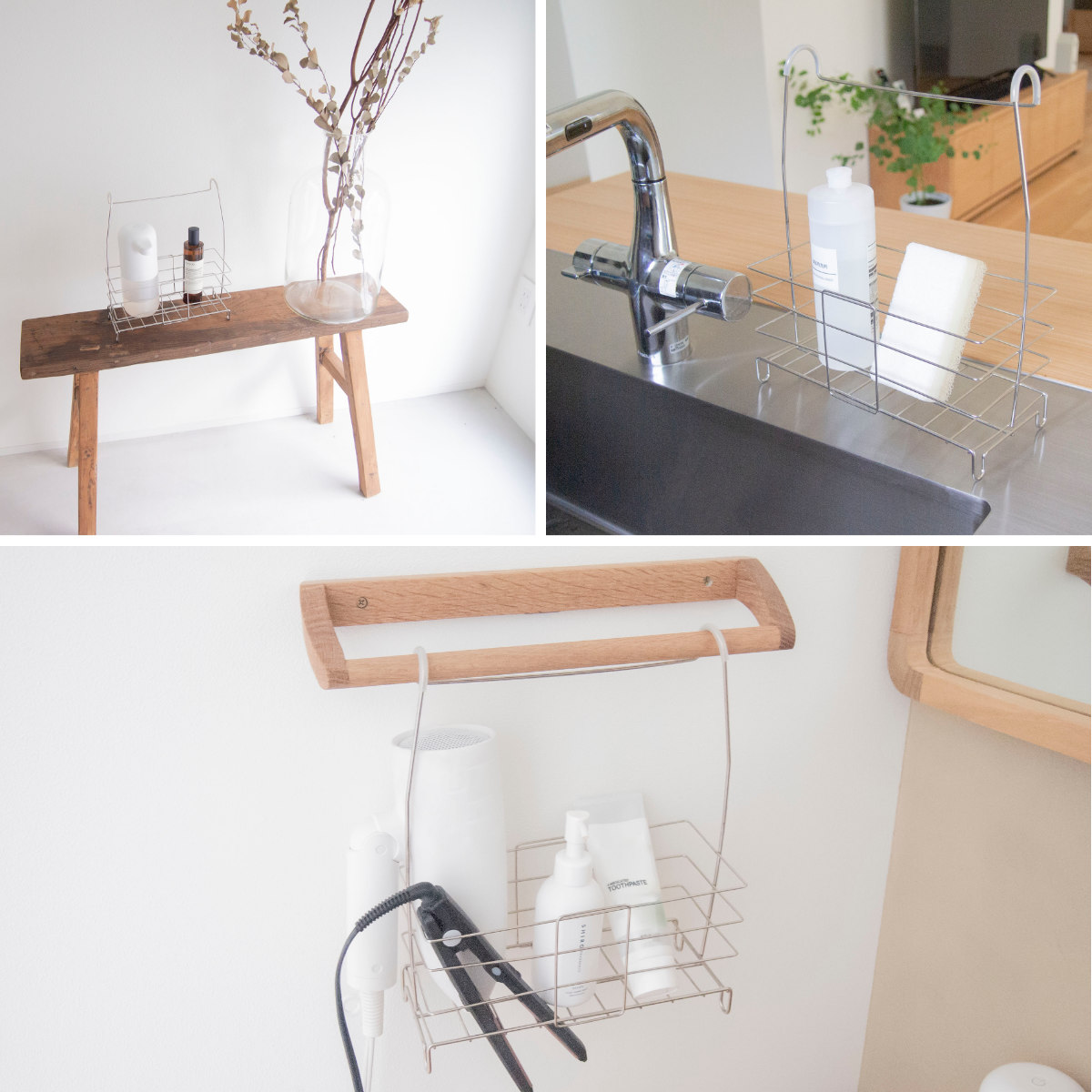 お風呂場だけでなく、洗面所やリビングなどでもお使いいただけます。ステンレスの曲線が美しいデザインはシンプルなのでインテリアに馴染みます。テレビのリモコンラックとして、ヘアアイロンやドライヤーの収納に、キッチンでスポンジや洗剤を入れるなど、様々な活用方法がございます。