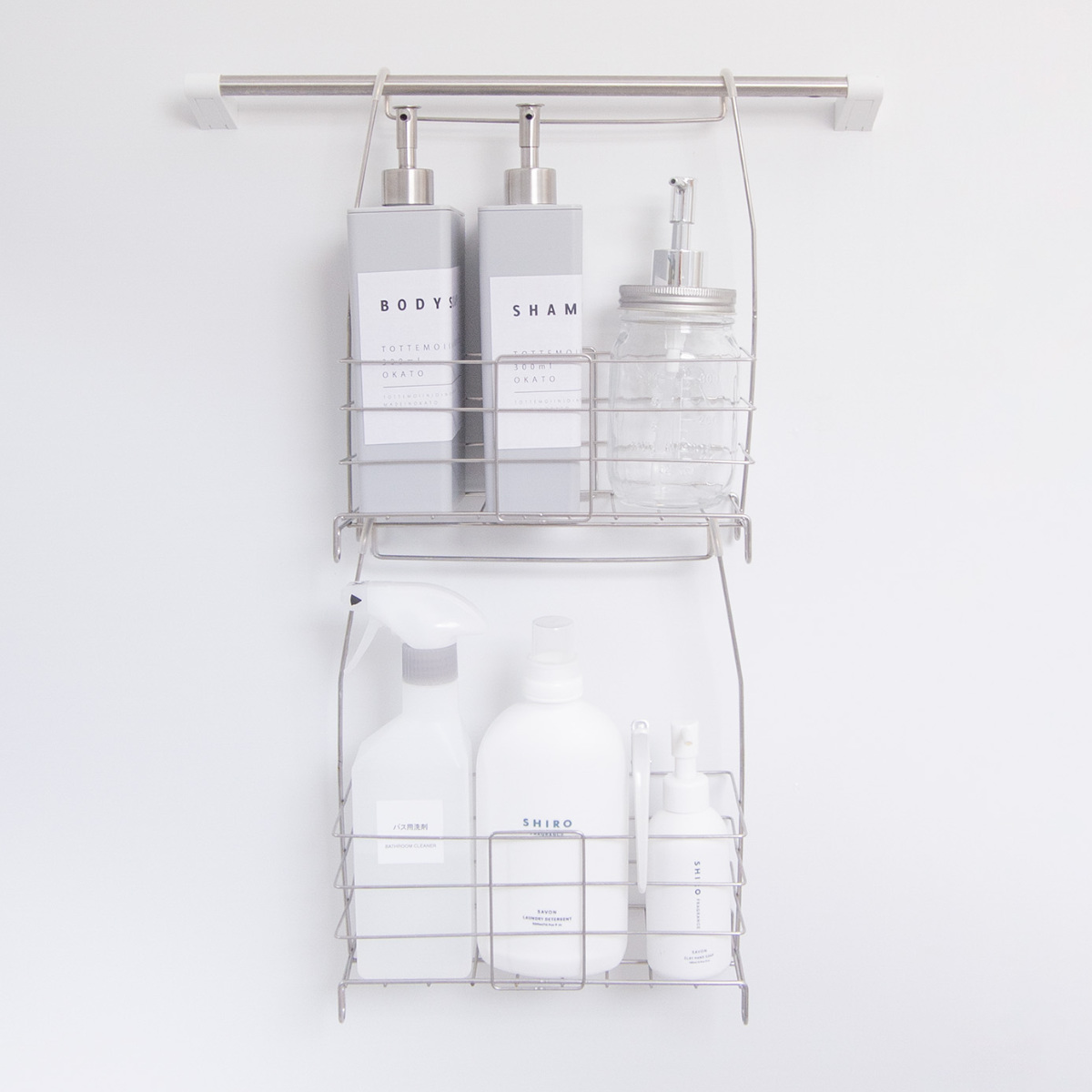 バスケットは2個ご用意いただくと、連結してお使いいただけます。手軽に収納スペースを増やすことができ、ヘアケアとボディケア、お風呂グッズとおもちゃ、家族分ごとなどに分けて収納したい時に大変便利です。