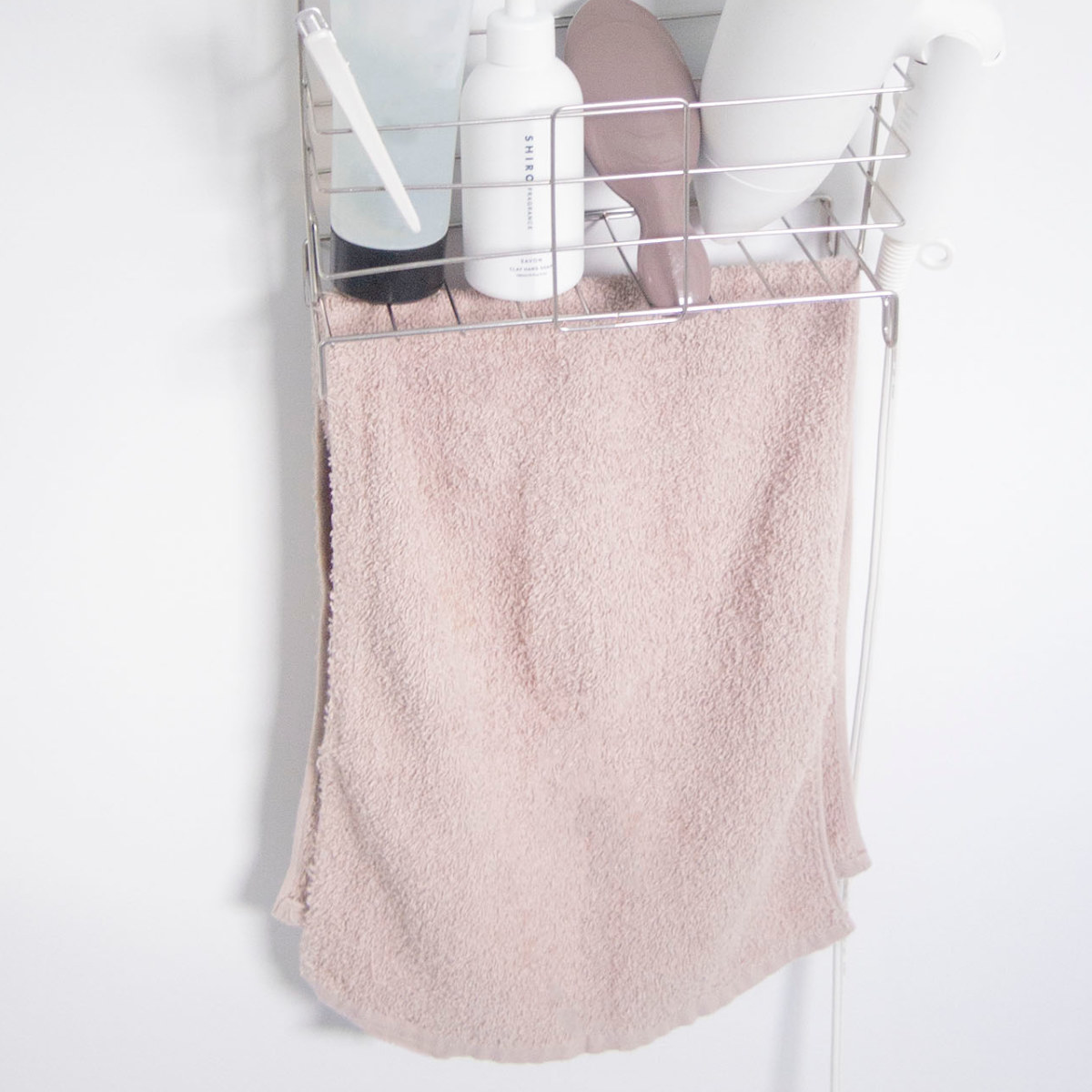 浴室内のタオルバーに引っ掛けて収納スペースを増やせるバスケットです。吊るして収納するので水切れが良く、底面にぬめりが付かないのでいつでも清潔です。