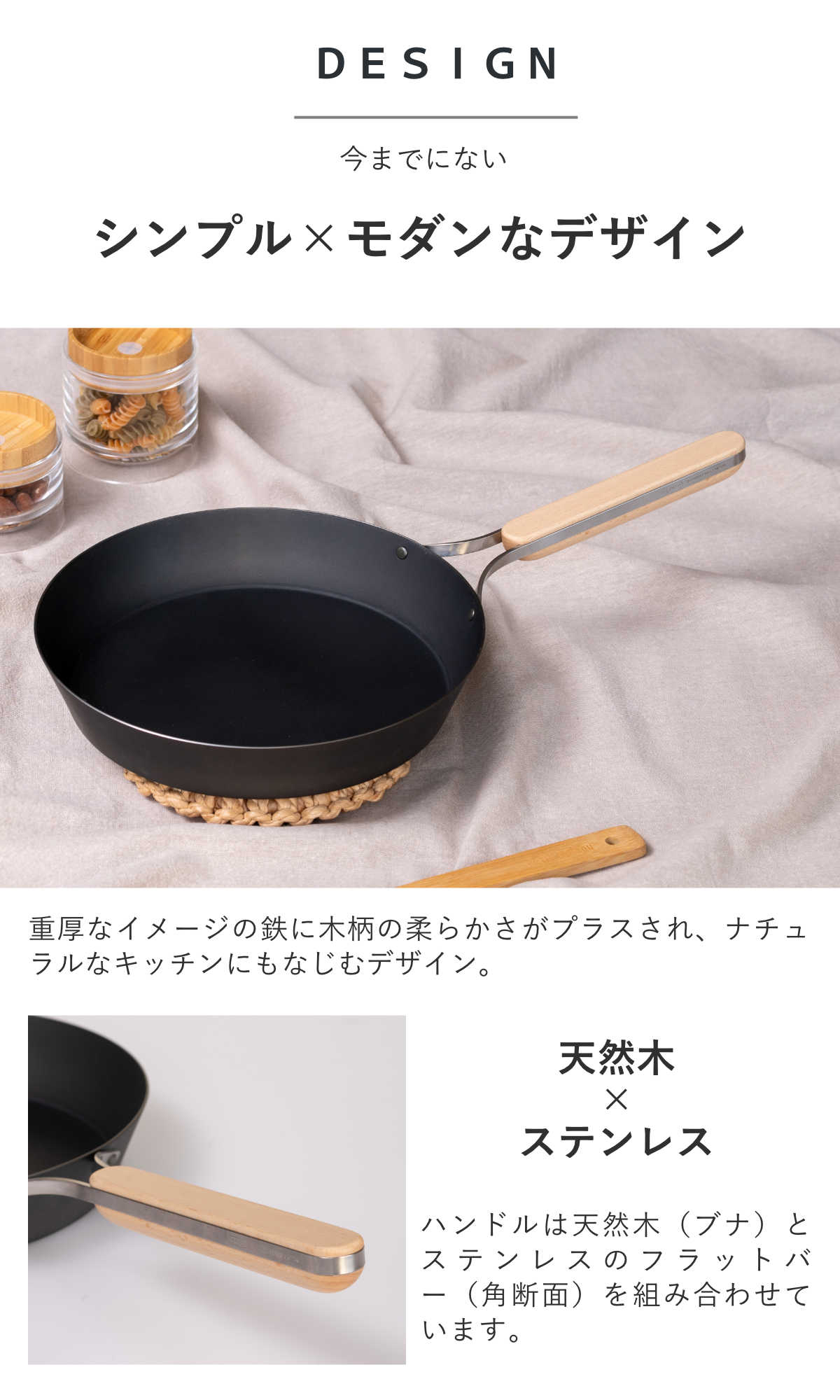 | 材質 | 本体:鉄 内面・外面:シリコン樹脂塗装 ハンドル:天然木(ブナ)、ステンレス |