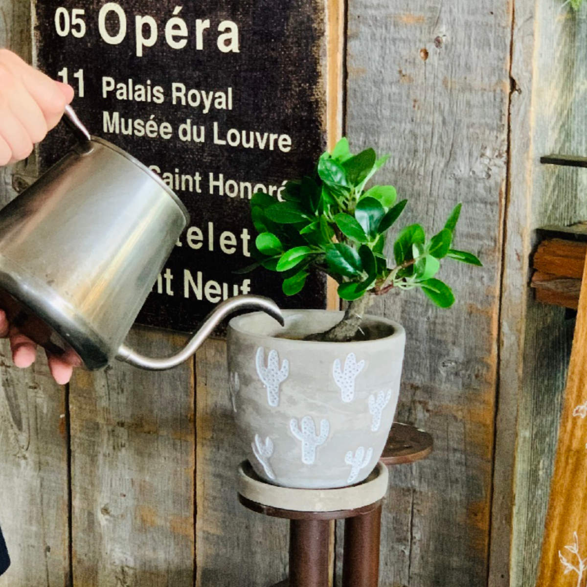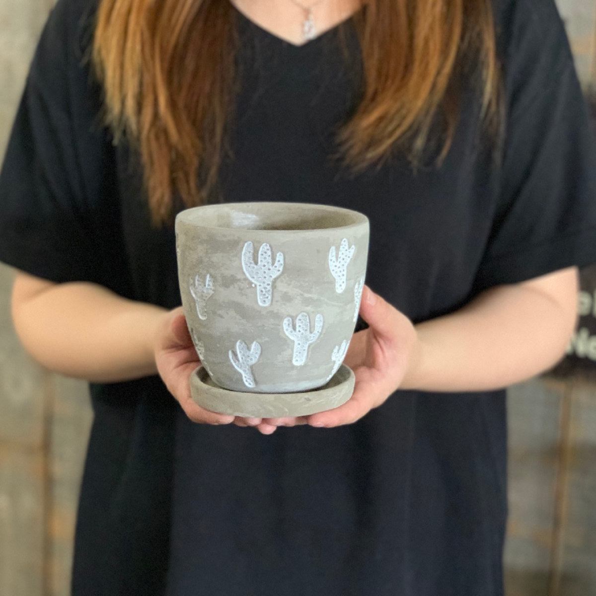 少しいびつな形が味わい深く、刻印されたサボテン柄が特徴的なプランターです。手彫り感のあるデザインが、お部屋をほっこり柔らかい雰囲気にしてくれます。植物との相性もバッチリです。