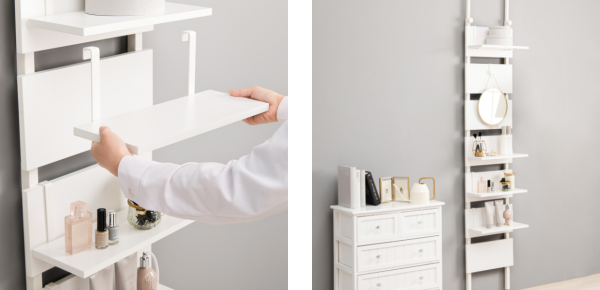 ●突っ張りラックと棚板で異なるサイズを使って、段差をつけることができます。