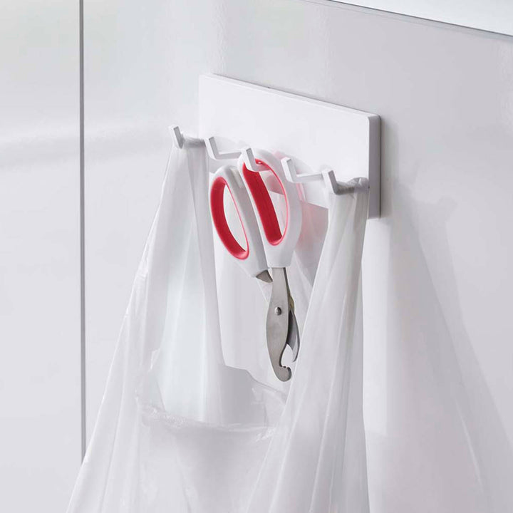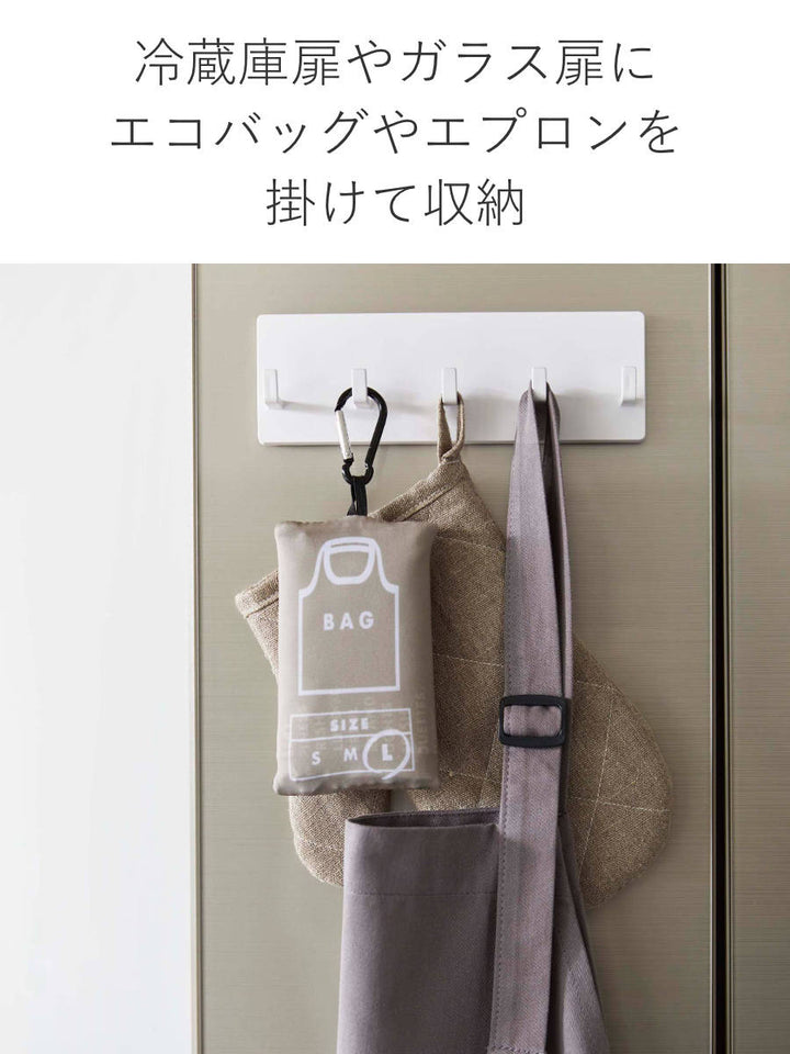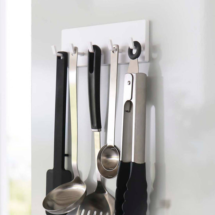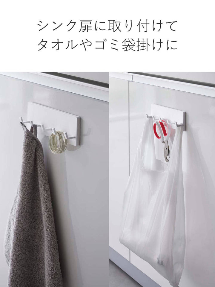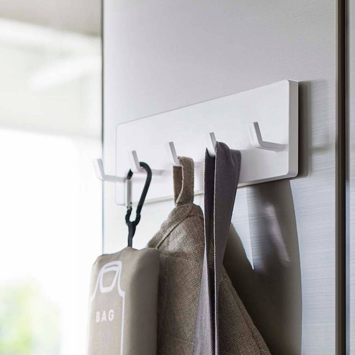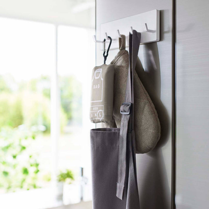 キッチンの壁はもちろん、冷蔵庫やシンク扉などに取り付けることもできます。エプロンやミトン、タオルや輪ゴム、ゴミ袋などを掛けたりと幅広く使えます。