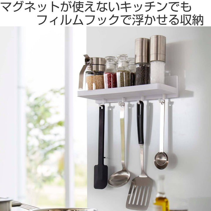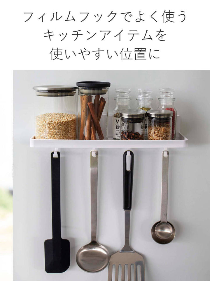 マグネットが使えない場所でも浮かせる収納ができるフィルムフックです。キッチンの壁など光沢のあるツルっとした面に取り付けできるので、調味料などを使いやすい位置に収納できます。浮かせることで、毎日のお掃除も楽々できます。