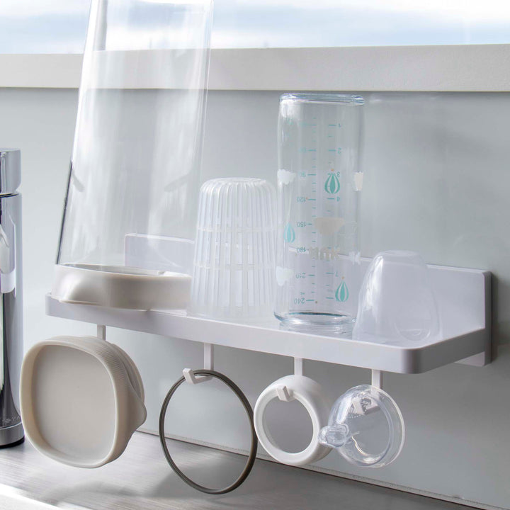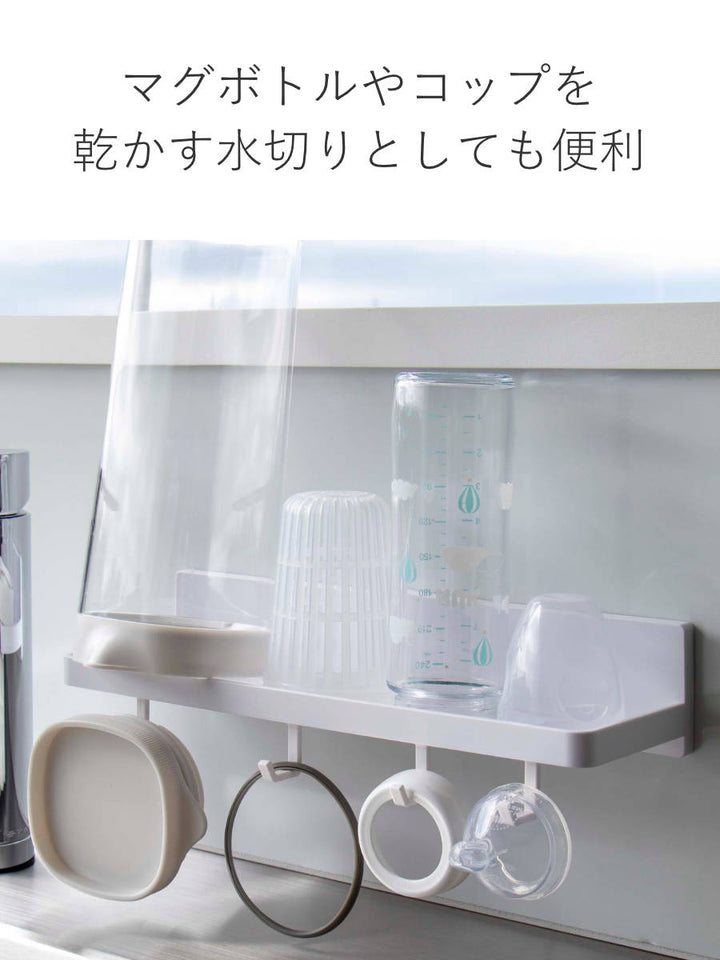水抜け穴があるので、哺乳瓶やグラスやマグボトルなどを乾かせます。付属のフックでパッキンや蓋を吊るせます。