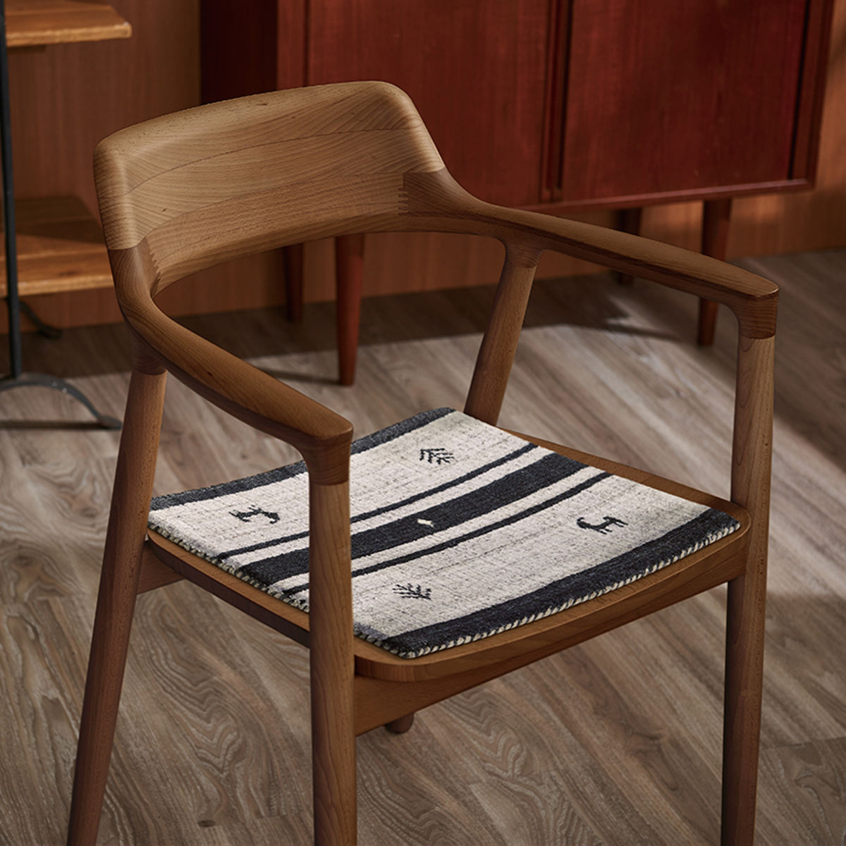 カシュガイ族が織る伝統的な敷物、ギャべのような柄のチェアパッドです。チクチク感の少ない滑らかな触り心地で、比較的遊び毛も少ないです。ひとつひとつ手織りで作られているので、世界でひとつだけの風合いをお楽しみいただけます。