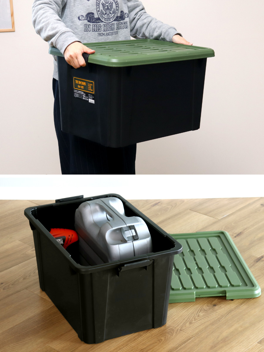 持ち運びに便利なコンテナケースは、キャンプなど屋外のアクティビティや、ガレージで使用する道具入れにするのもオススメです。フタが雨水や砂ぼこりの侵入を防ぎ、汚れてもサッと水洗いできます。