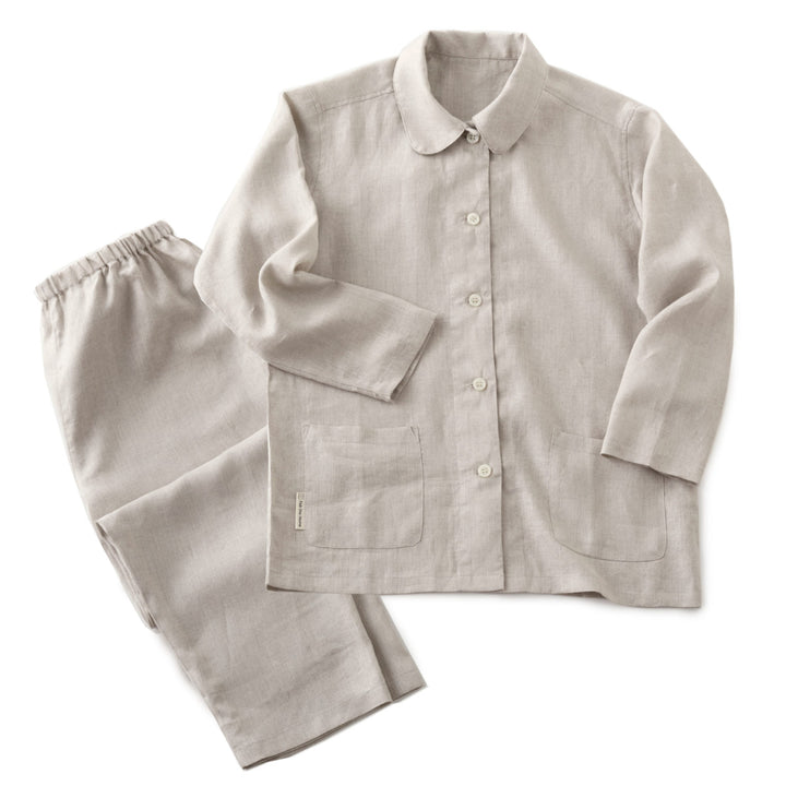 ヨーロッパ産の麻60番手の糸を織り上げた、さらりと軽い上質なリネンのパジャマです。欧州女性の美しい髪色を「亜麻色の髪」と表現するように、麻糸には独特の光沢感があります。通気性・速乾性に優れたリネンのパジャマは、蒸れにくく肌に張り付きにくいので暑い夏にぴったりです。