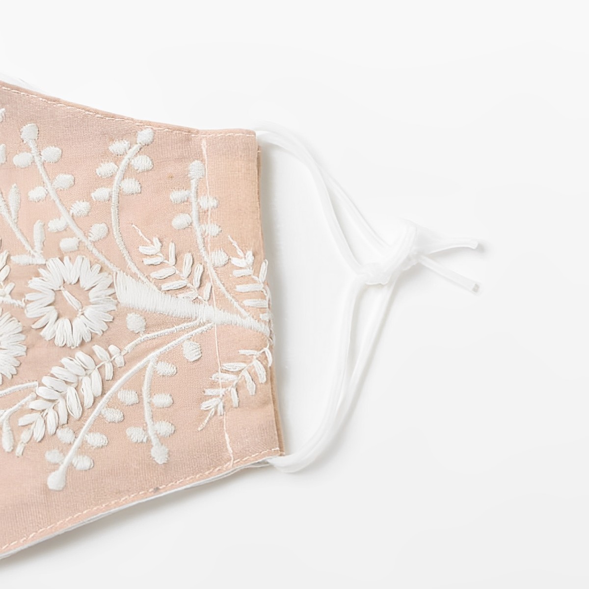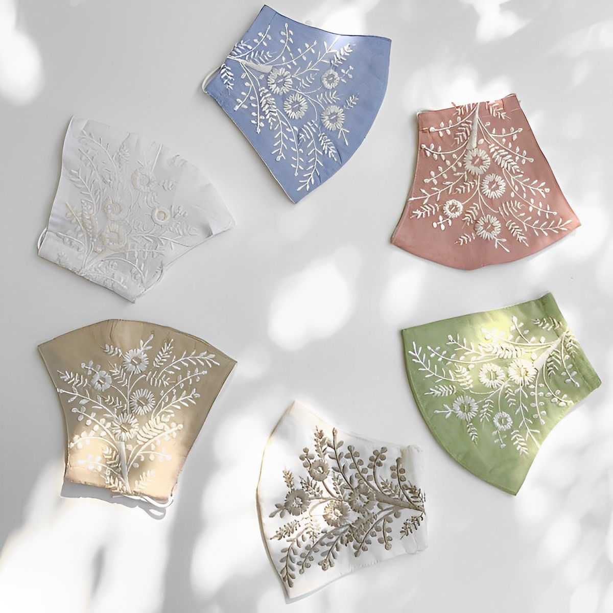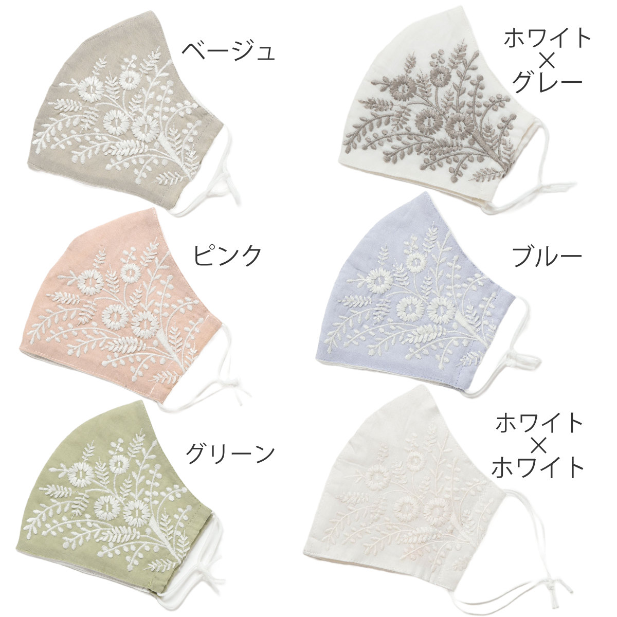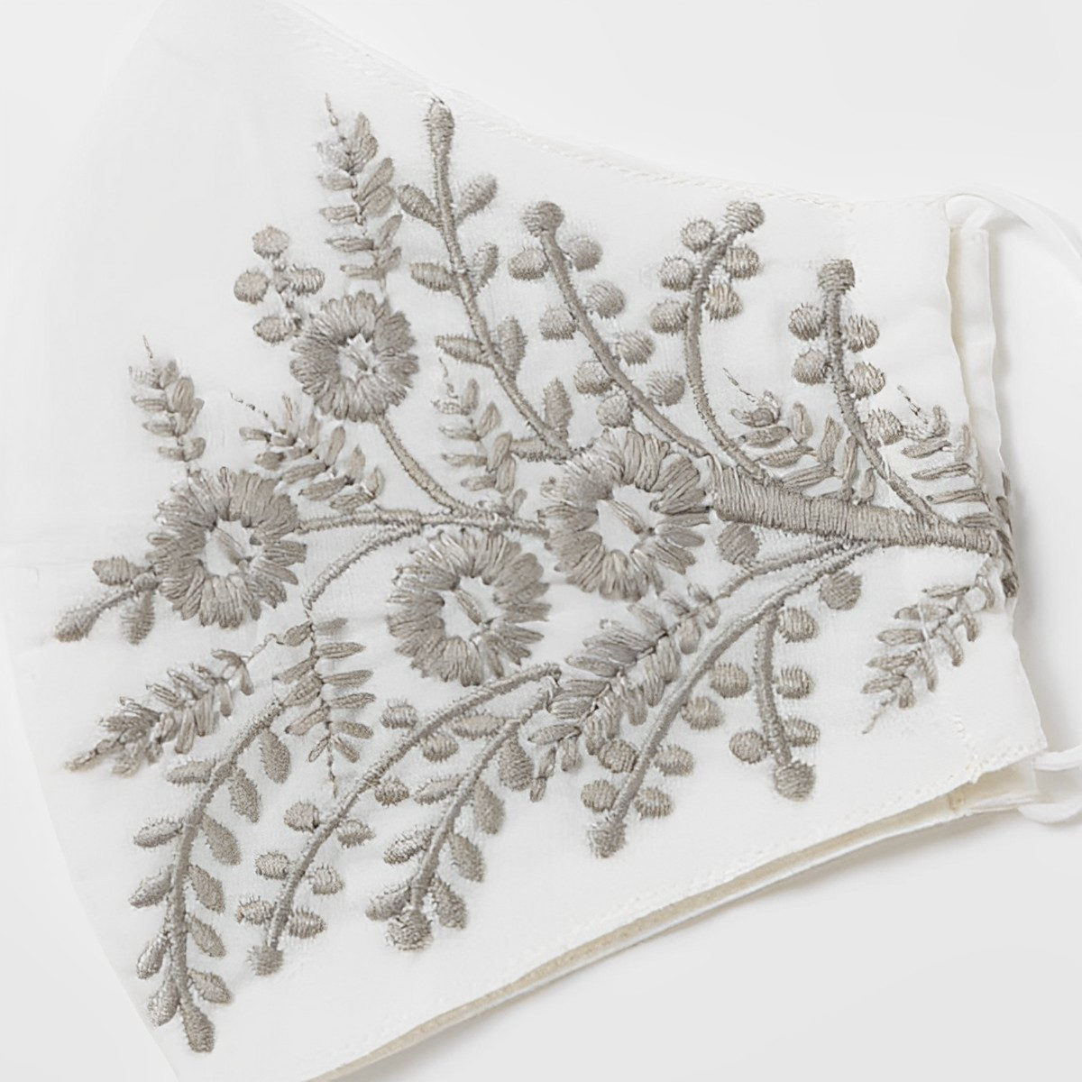 繊細で美しいボタニカル柄の刺繍がおしゃれなマスクです。その日の気分によって色を変え、アクセサリー感覚でお使いいただけます。お顔まわりがパッと華やぐデザインです。