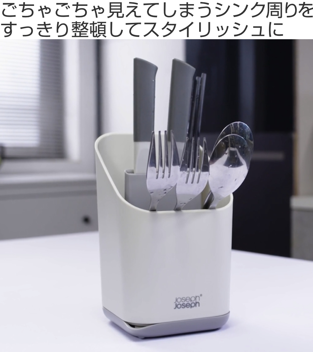 カトラリーやと包丁を立てて水切りできる、樹脂製のカトラリードレーナーです。生活感の出てしまうシンク周りをスタイリッシュに演出します。