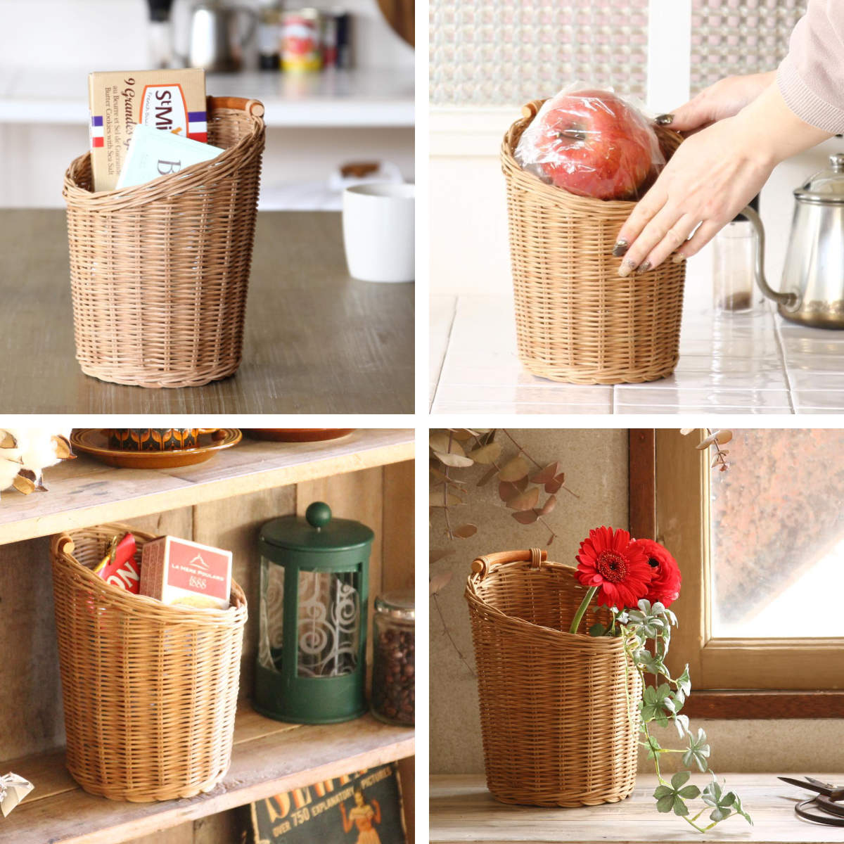 お部屋に置くだけで様になるバスケットは、インテリアのように「見せる収納」としても活躍します。小物収納だけでなく、ちょっとした果物や野菜を入れたり、ティースプーンなどのカトラリー収納にもおすすめです。ドライフラワーや植物の収納にも相性が良く、入れるだけでおしゃれに飾っていただけます。