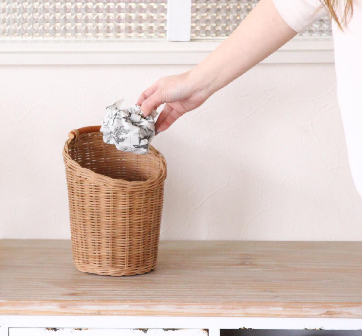バスケットは、収納だけでなくゴミ箱としても使うのもおすすめです。ゴミ箱にバスケットを利用することでお部屋の生活感がぐっと押さえられます。