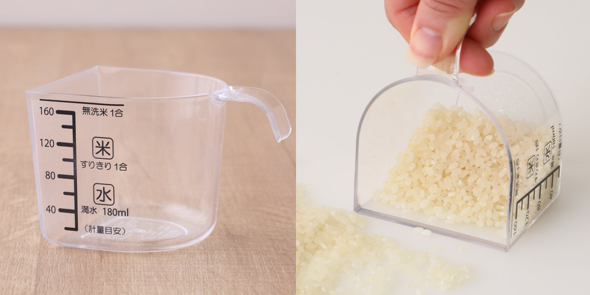 付属の計量カップは片側がフラットなD型形状で底面にフィットする形となっており、底面のお米もきっちりすくい取れます。普通米と無洗米の両方が計量できるのも嬉しいポイントです。