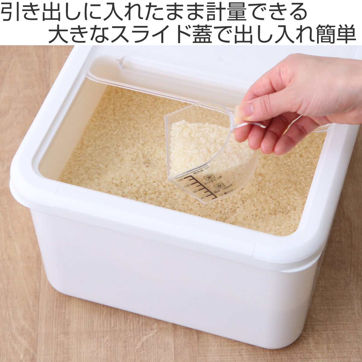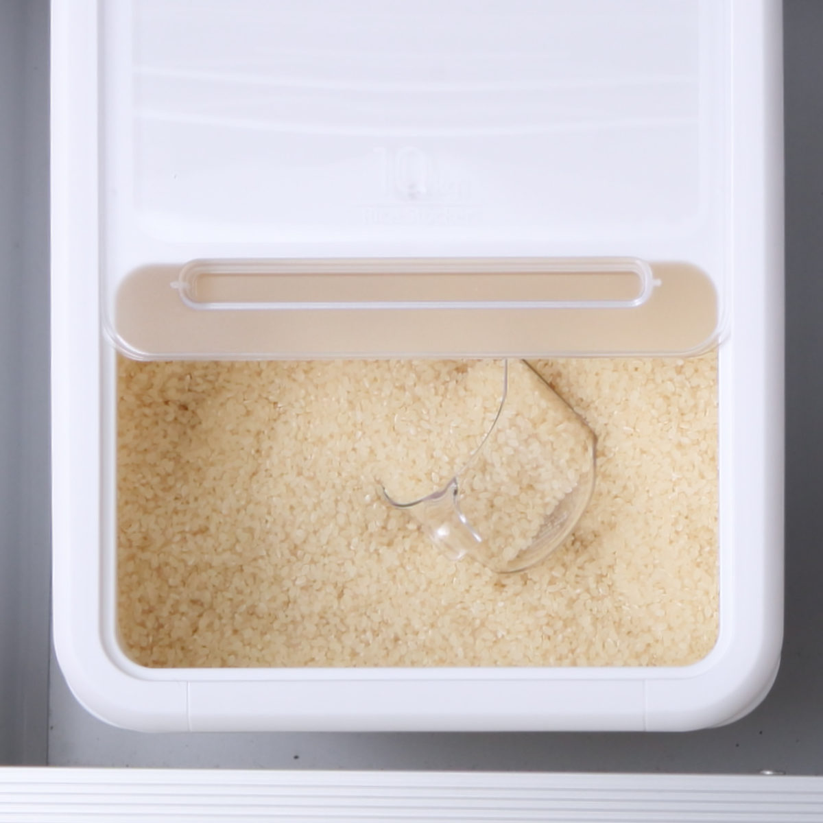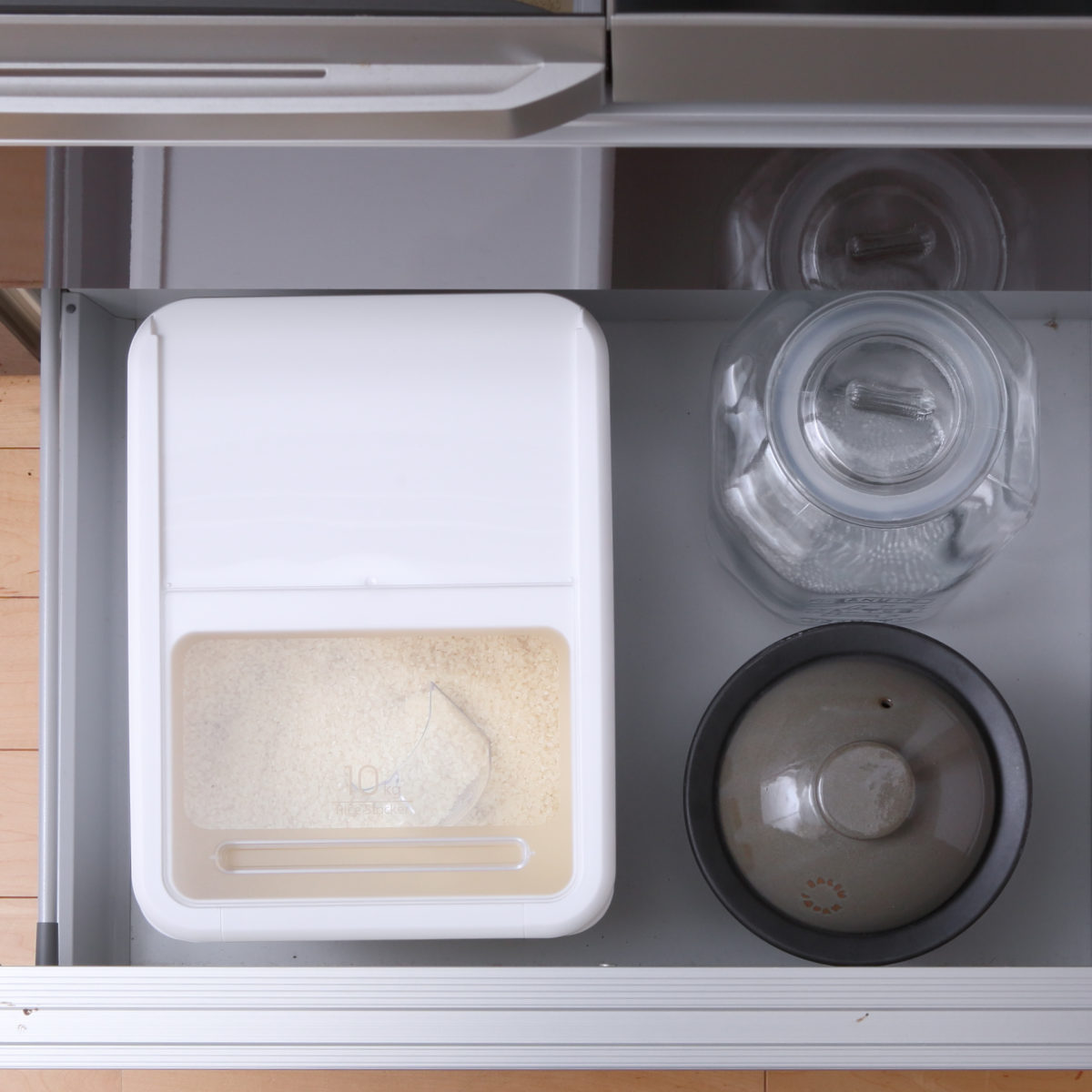 システムキッチンの引き出しに収納できる米びつです。スライド式の蓋なので、米びつを引き出しに入れたままお米の計量ができます。重たいお米を運ばなくていいのが嬉しいポイントです。