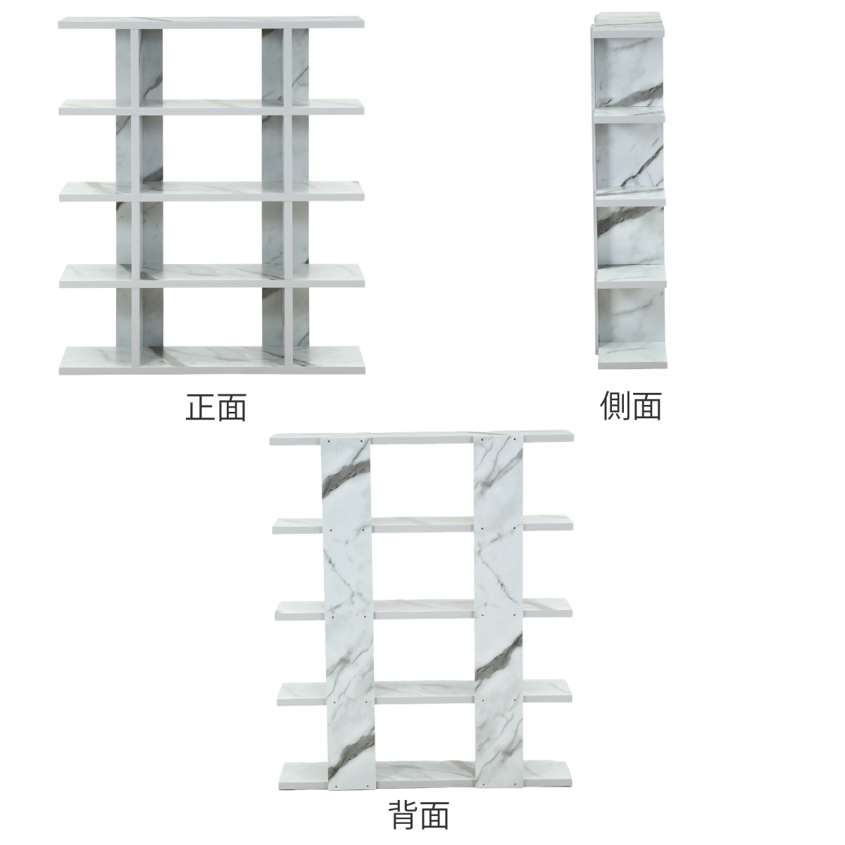 大理石のような模様が全面にプリントされた5段のオープンラックです。どんなお部屋にも使いやすいシンプルなデザインで、置くだけで高級感のある上品な空間が作れます。