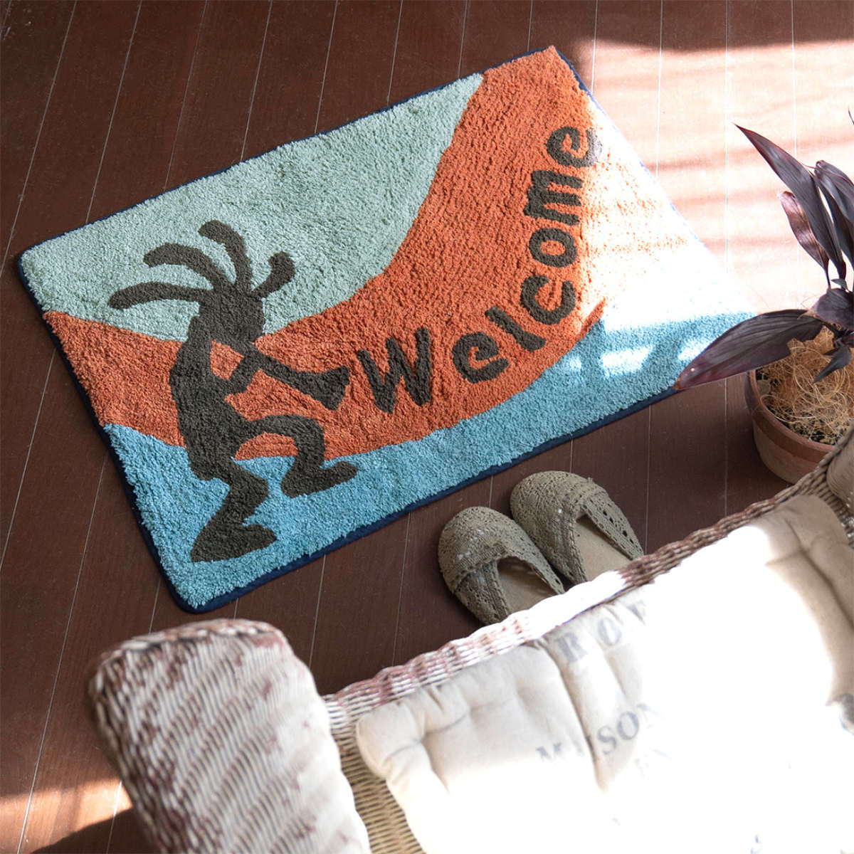 ネイティブインディアンの伝説にでてくる精霊ココペリの玄関マットです。「土地を肥沃にし、その背中から種をまく」としてネイティブアメリカンに豊穣の神とされ、笛を吹きながら幸せを運んでくると言われています。幸運を運ぶココペリが愛らしく、生活シーンにそっとぬくもりをプラスしてくれます。