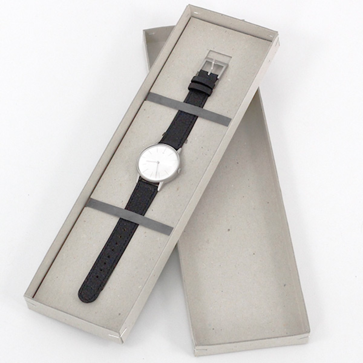 盤面は直径36mm、ベルト幅は18mm、重さは約30gと超軽量。性別問わず使いやすいサイズです。盤面や針なども非常にシンプルで、研ぎ澄まされたミニマルデザインながら高級感があります。