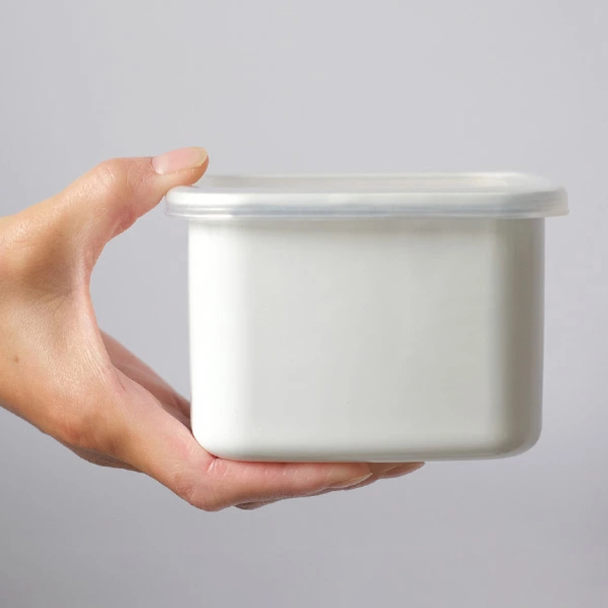 ●本体はホーロー製、密閉フタは樹脂製の、四角型の保存容器です。