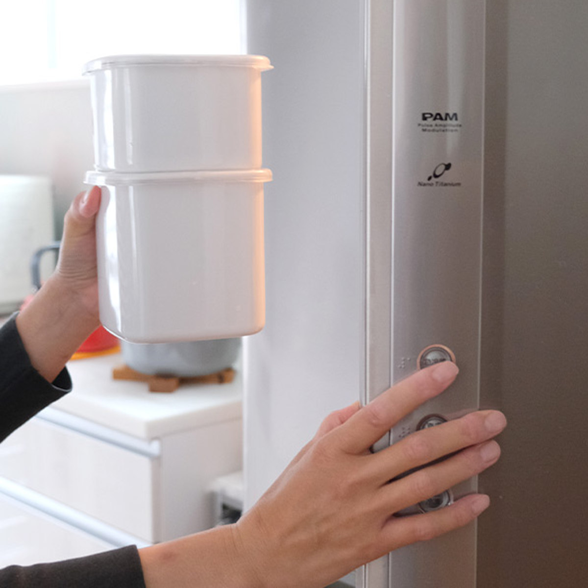 ●積み重ねてスマートに冷蔵庫でも収納できます。