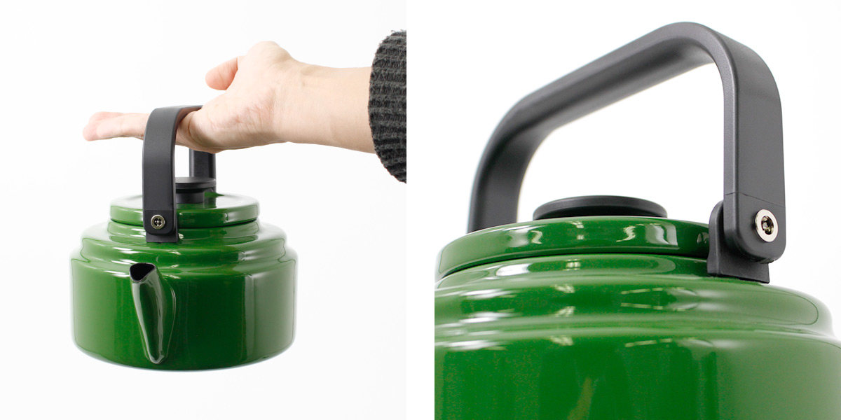 デザイン・使用感・洗いやすさ、すべてにおいてこだわった新しい定番のケトルは、持ち手となるハンドルは90度に倒れるので注水もしやすく、収納時もコンパクト。安定感があって使う人にやさしい樹脂ハンドル・つまみは、著名プロダクトデザイナー:柴田文江氏によるデザインです。