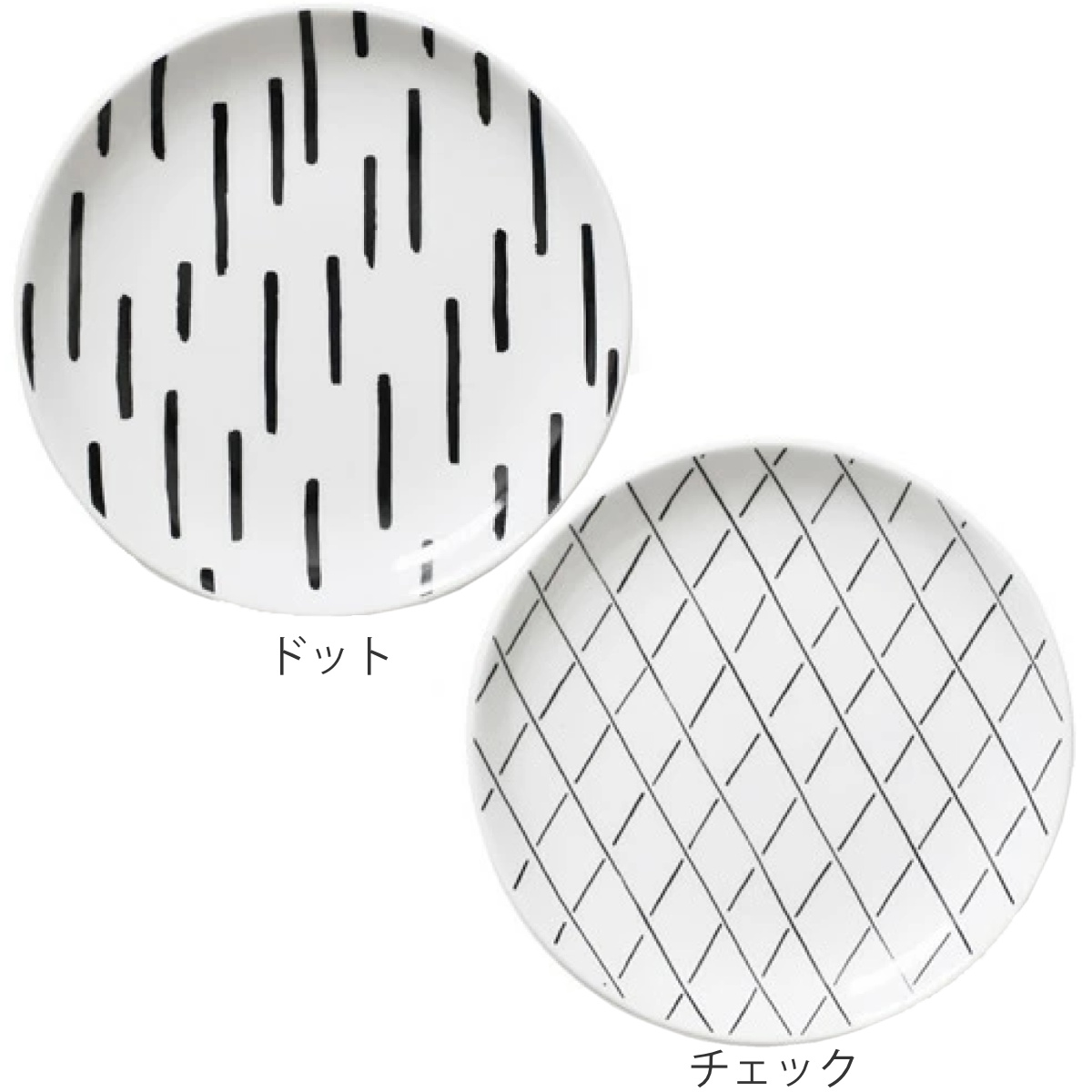 イラストレーターのかおりさんが一筆一筆丁寧に描いています。ドットは大きな雨粒のような独特の水玉模様が印象的で、モノトーンカラーがスタイリッシュな雰囲気を演出しています。格子模様のチェックは、日本人にはなじみのある網目の器のようであり、和食器にはないスッキリした新しさのある柄です。
