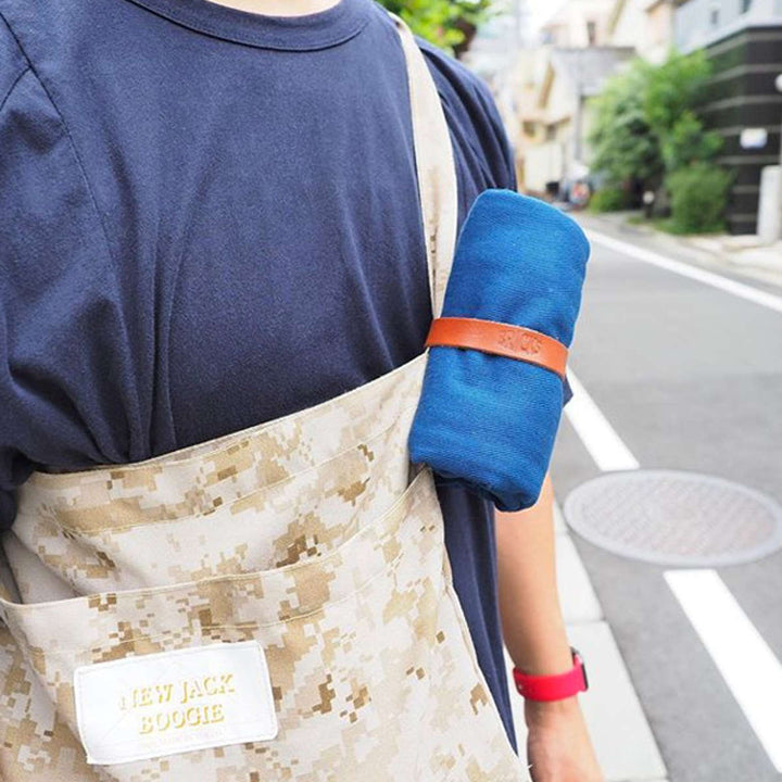 ●折りたたみは簡単です。細長く畳んだのち、クルクル巻いてレザーのスナップボタンを留めるだけです。