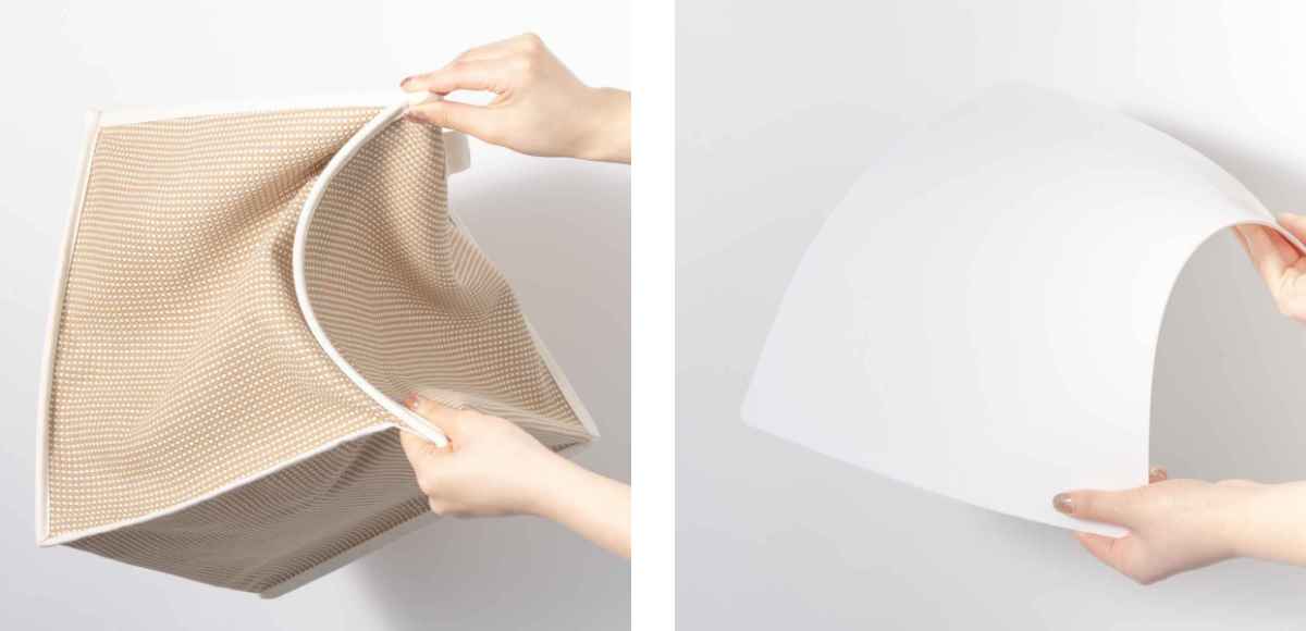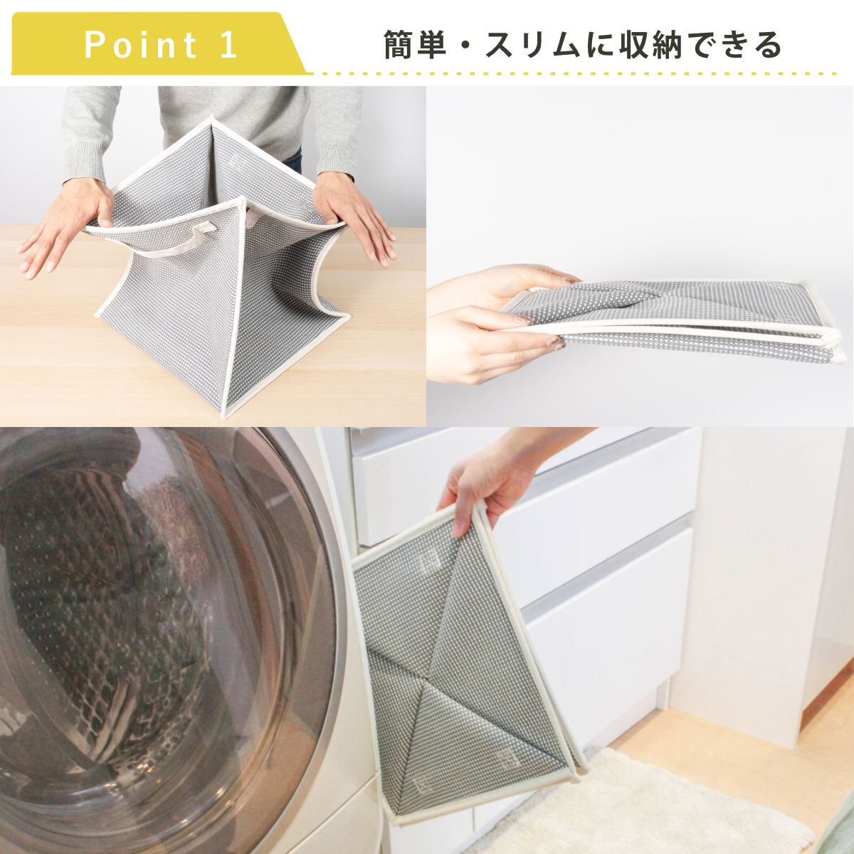 使う時はフチを引っ張って広げ、使わない時は角を下へ押し込みながらねじるだけです。どなたでも簡単にご使用いただけます。