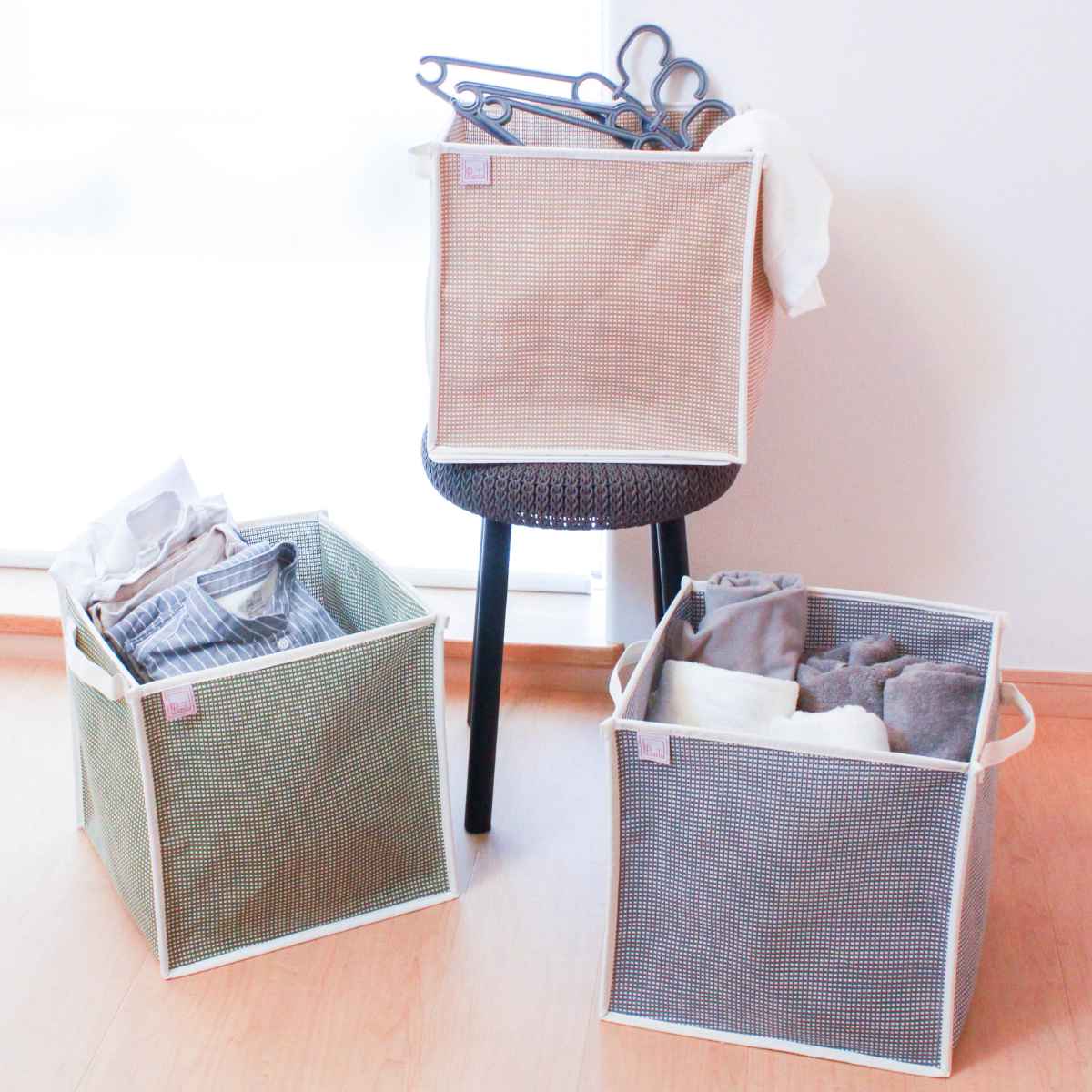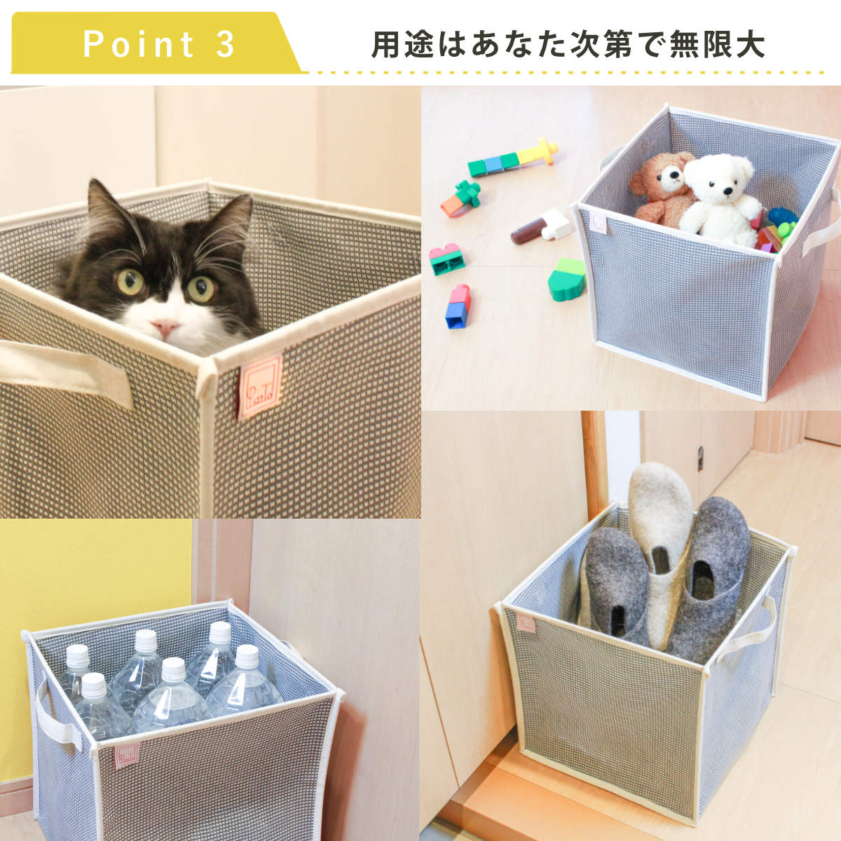 自然素材のコットンが持つやわらかな風合いは、洗濯用としてだけでなく、子どものおもちゃ入れや玄関収納、猫の遊び場など、暮らしにやさしくなじみます。