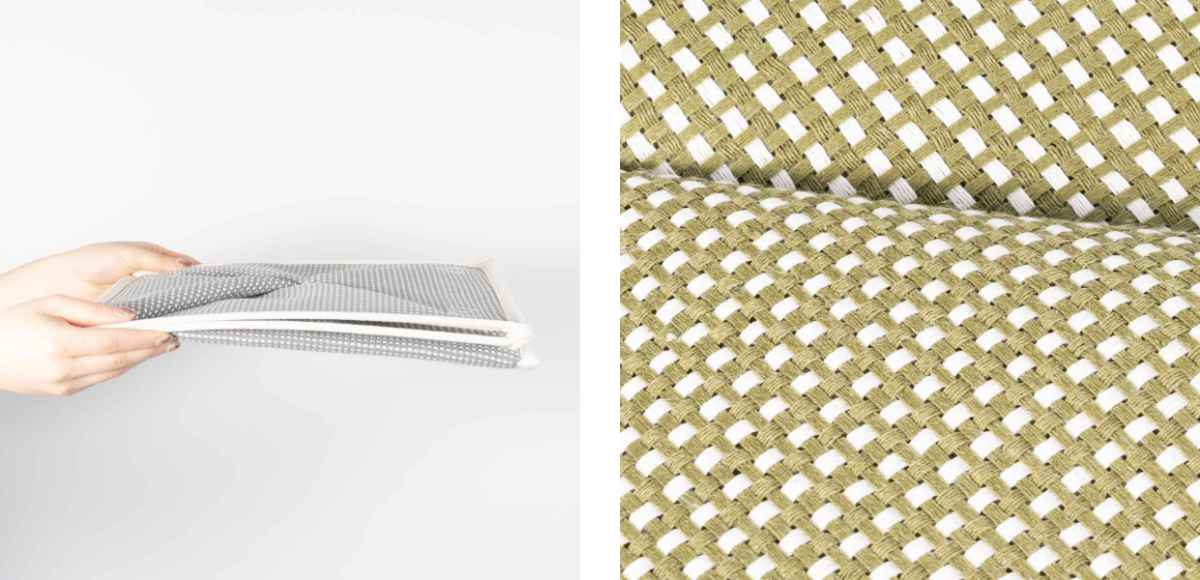 柔らで軽いコットン素材を使用しつつ、中敷の芯材によって美しいスクエア型をしっかりキープしています。摩擦や水にも強い素材で、安心して長くお使いいただけます。