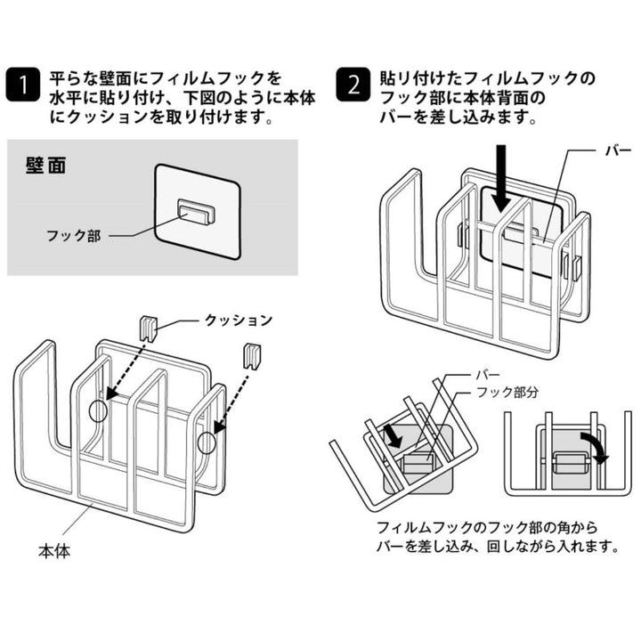 | 備考 | 取り付け可能な壁面:光沢のある平らな油染みしない面(フィルムフックの接着面よりも大きい面・タイル・プラスチック面・ステンレス・ガラス・金属塗装面・人工大理石) |