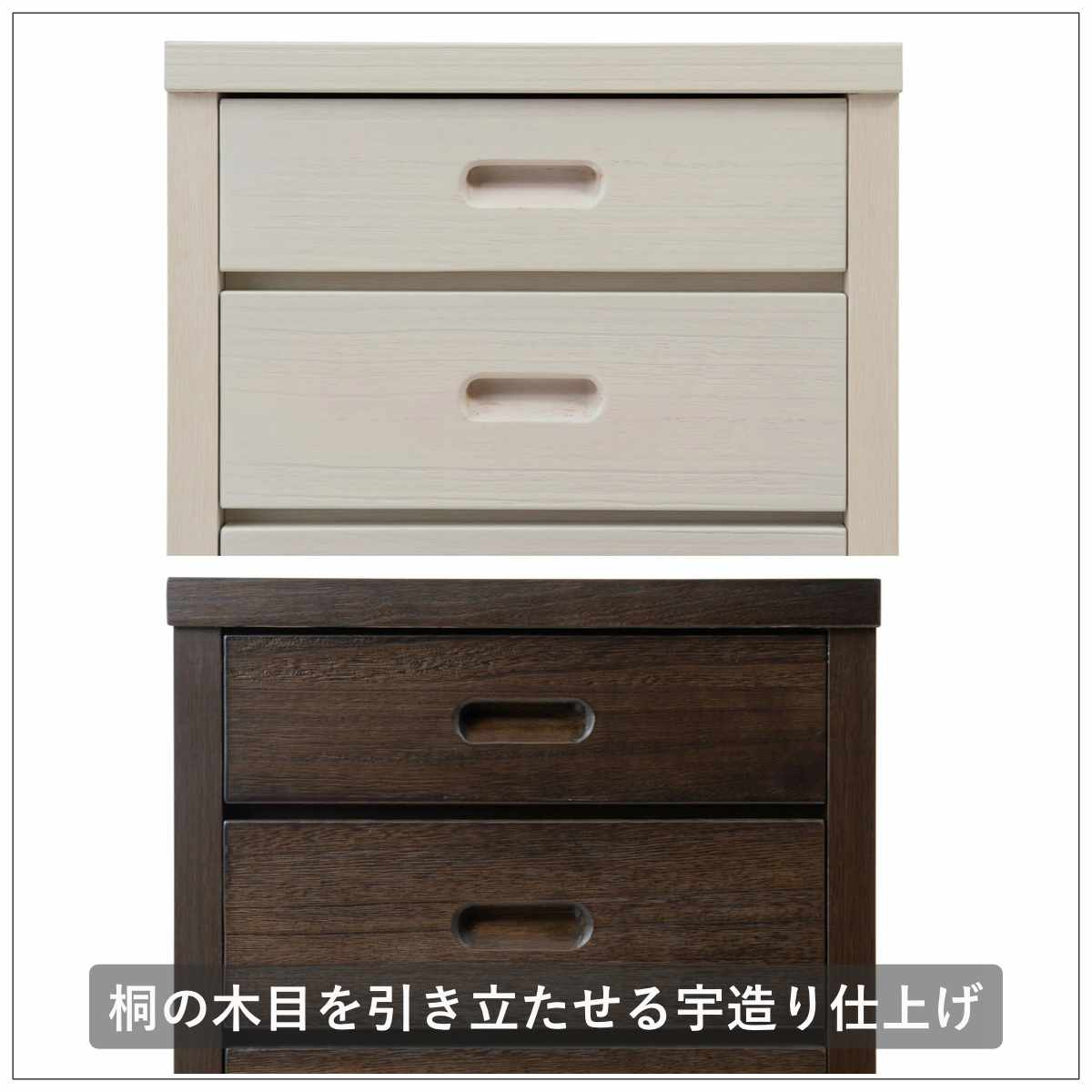 前板には、天然木桐材の木目を凹凸に加工した宇造り仕上げが施されているので、木目がより美しく引き立ちます。